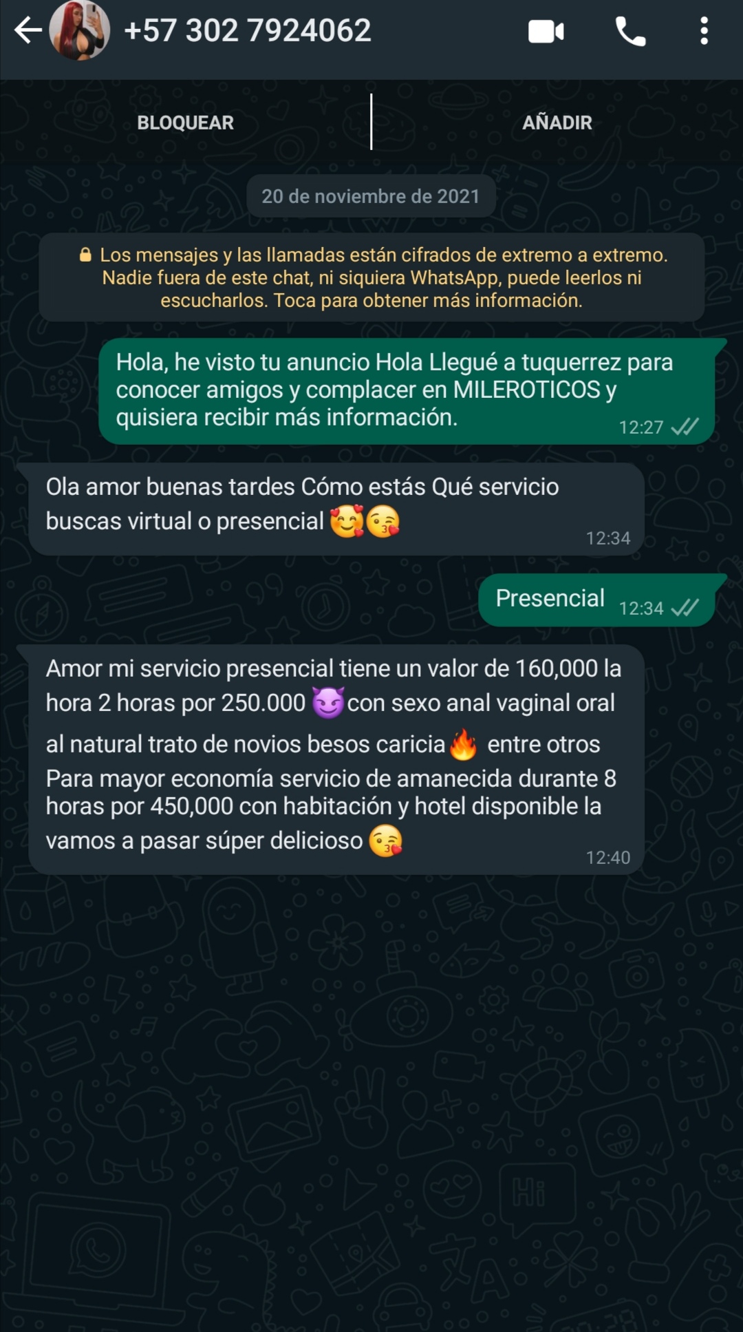 Gracias parcero por el aviso me sucedió algo similar la semana pasada pero de otro número 3176663991Esta chica te extorsiona después que le escribe. OJO!! con ella
