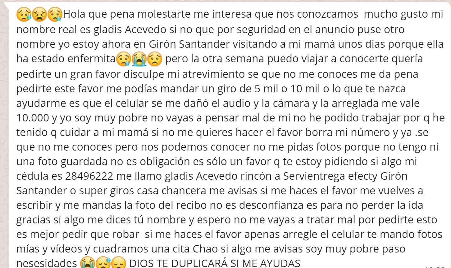 Lo mas increíble de todo es que siguió contestando después que le mande la foto, que mil gracias, que mi dios se lo pague, etc... cuadramos para vernos al siguiente día (ayer Martes) como yo seguía dudando le escribí el Martes en la mañana y ohhh sorpresa me contesto, lista la hora y sitio. Aun con dudas me fui, llegue al sitio, no pague la habitación y espere 30 minutos, le escribí y la llame y no me contesto. Menos mal no bote la plata y me fui a otras cosas, en la noche le escribí y le dije que si se iba a robar lo del giro que listo pero para que me hacia ir a perder tiempo y plata yendo a un hotel, no me contesto. Cuando le dije que iba a contar para que otros no cayeran me contesto: "que la perdonara" " que la Mama se había enfermado y la había tenido que llevar al hospital" que nos viéramos hoy, que seguro era fijo todo, yo obviamente no me fui otra vez al hotel, le escribí hoy y le dije que me dijera la verdad si no iba a ir que no me hiciera perder mas tiempo y otra vez "que no tenia plata, que perdón" "que estaba en el hospital con la mama" me mando una foto que no se cree nadie, que no había desayunado y no tenia con que darle comida a la mama... bla, bla, bla.