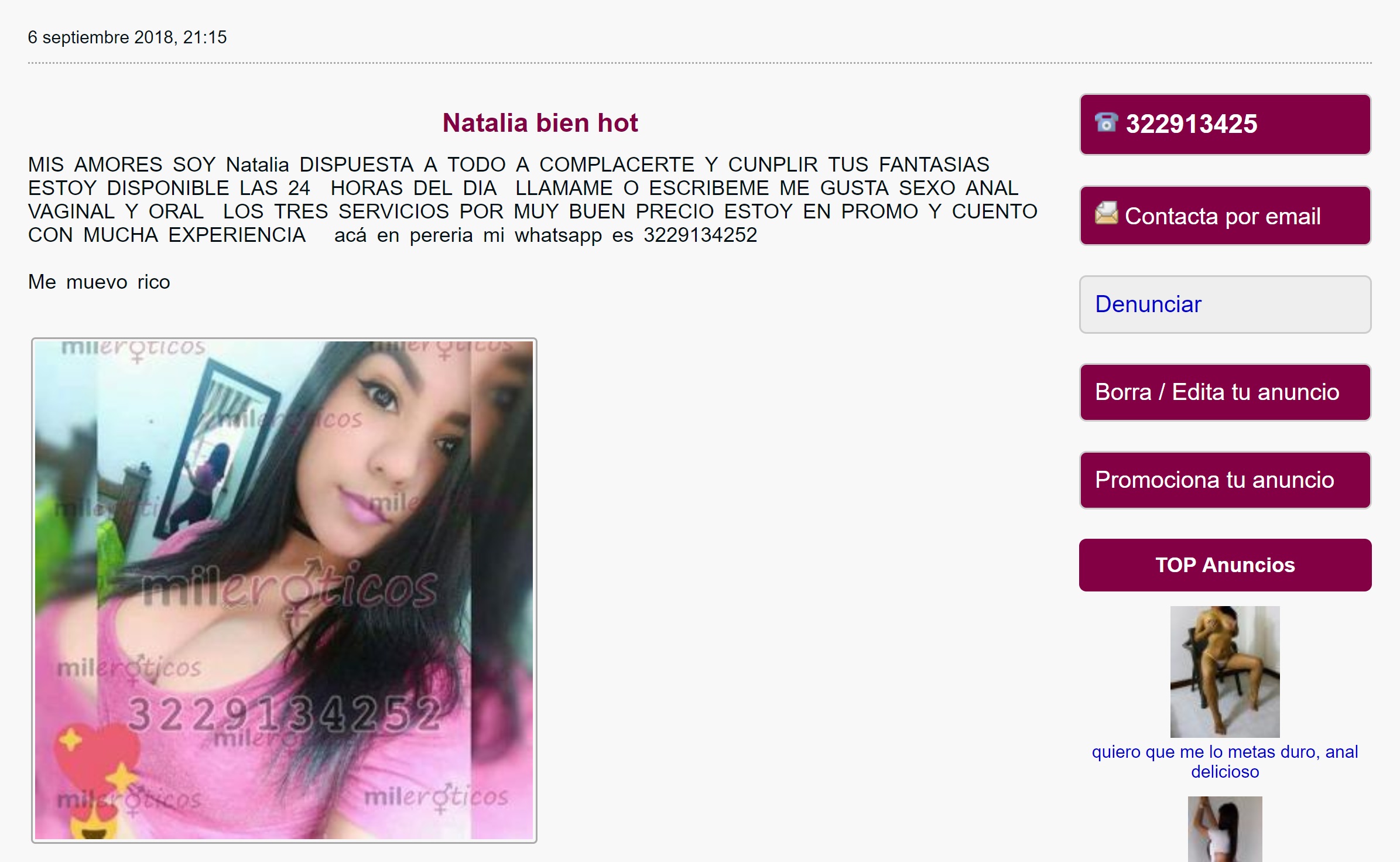 En esa búsqueda encontré una nena publicando todos los días, pero no deja los anuncios anteriores, solo sube el anuncio una vez al día. Le escribí para vernos y me dijo que $ 70 un buen rato, en las fotos se ve buena, tremendas tetas, dice que es nueva, a veces coloca foto en el perfil de whatsapp y sin ser la mas linda no es fea. Ese día no pude cuadrar la hora y de pronto a los dos días me escribió "que estaba muy mal, que no tenia comida en la casa (hp, duro que alguien diga eso) que por favor la ayudara con lo que pudiera para comprar comida para ella y la Mama" yo le dije que como así que si no le habían salido pues clientes que ella tenia un cuerpo bonito y en Pereira es bueno para las acompañantes y me dijo que no, que ni un solo cliente, yo le dije que muy raro. Mejor dicho ella se aburrió y me dijo me vas a ayudar si o no, yo le dije que no.