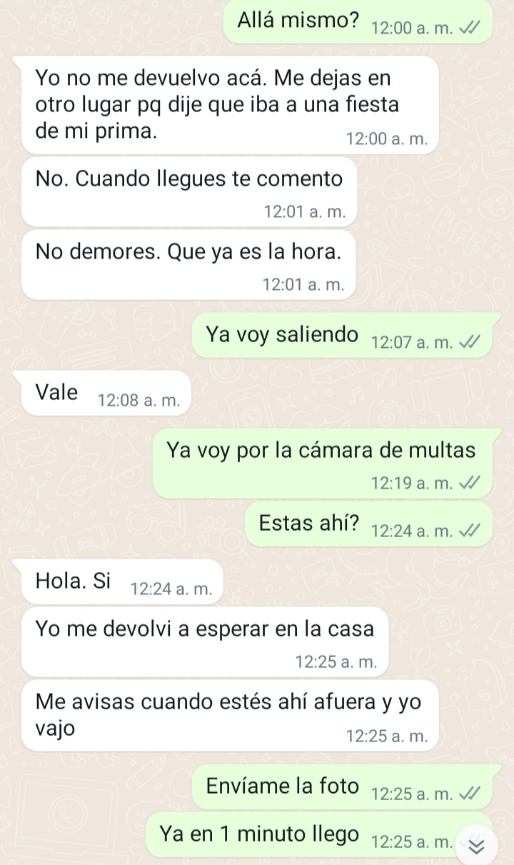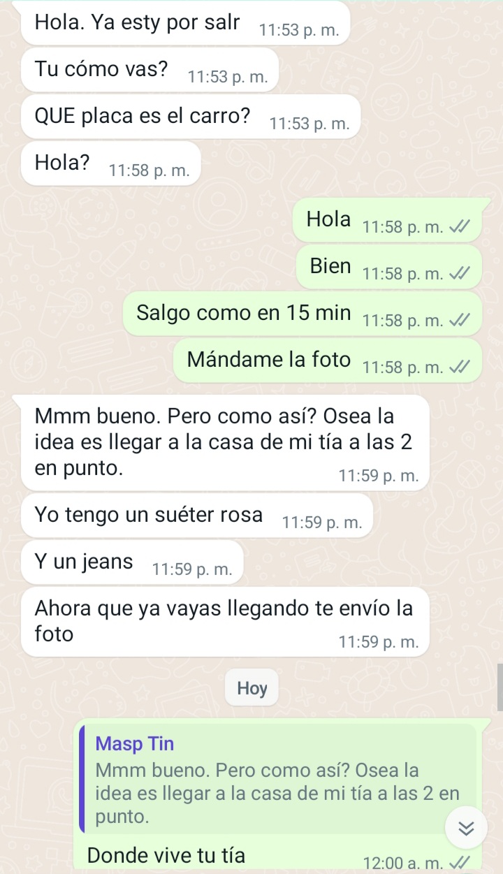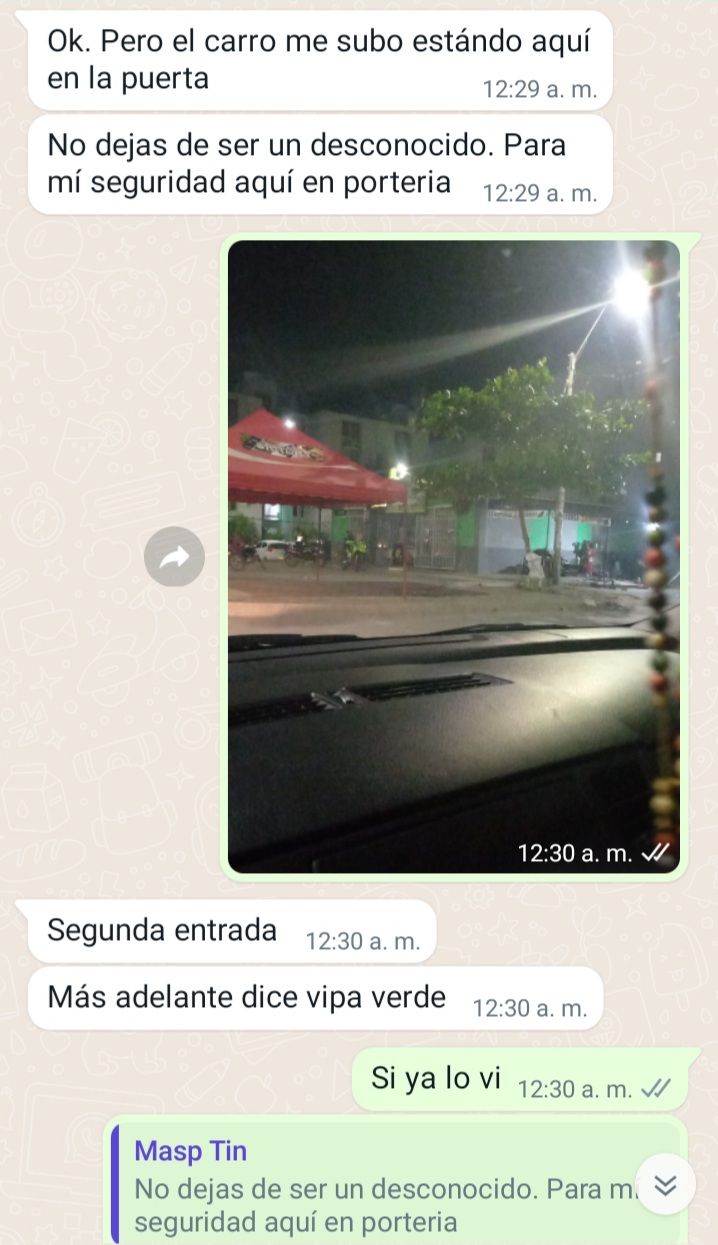 Inicialmente acordamos 1 hora en 150 (quizás el precio un poco elevado pero quería darle el voto de confianza). Habíamos cuadrado para encontramos por el CC americano a eso de la 5 pm, al llegar la hora me informa que no pudo salir de su casa y no podrá hacerlo sino hasta la noche como a las 11 a lo cual yo accedo pero a las 12 ya que tenia otro compromiso en la noche y no podría salir antes de esa hora, me dice que por la hora se le es muy complicado conseguir transporte por lo que me pregunta si yo la puedo ir a buscar, vive en el conjunto Vipa verde en caribe verde, yo accedo ya que hasta ese momento no desconfío de nada. Siendo ya las 12 me confirma que ya es la hora, y me pregunta la placa del carro (primera alarma) le informo que ya casi salgo y que estaría allá tan pronto pudiera, allí me dice que necesita estar donde un familiar a las 2 am en punto así que no me demorará, le pregunto donde vive la tía y no me da mayor información, dice que me lo comenta en persona (segunda alarma), le pedí una foto para saber como está vestida a lo cual se niega (tercera alarma), cuando voy llegando le informo que estoy cerca y me dice que la espere unos minutos ya que había subido al apto, que como yo la hice esperar media hora, yo no la podría esperar unos minutos, decido dar unas vueltas en el boulevard para esperar y no estar quieto ya que eso estaba bastante solo, veo que pasan 10 min y no se reporta (alarma final) le digo que por su seguridad y la mía podríamos dejarlo para otro momento ya que no me confiaba estar allí mucho más tiempo, a lo que ella me dice después de un rato que la bloquee y no le escriba más por incumplido.