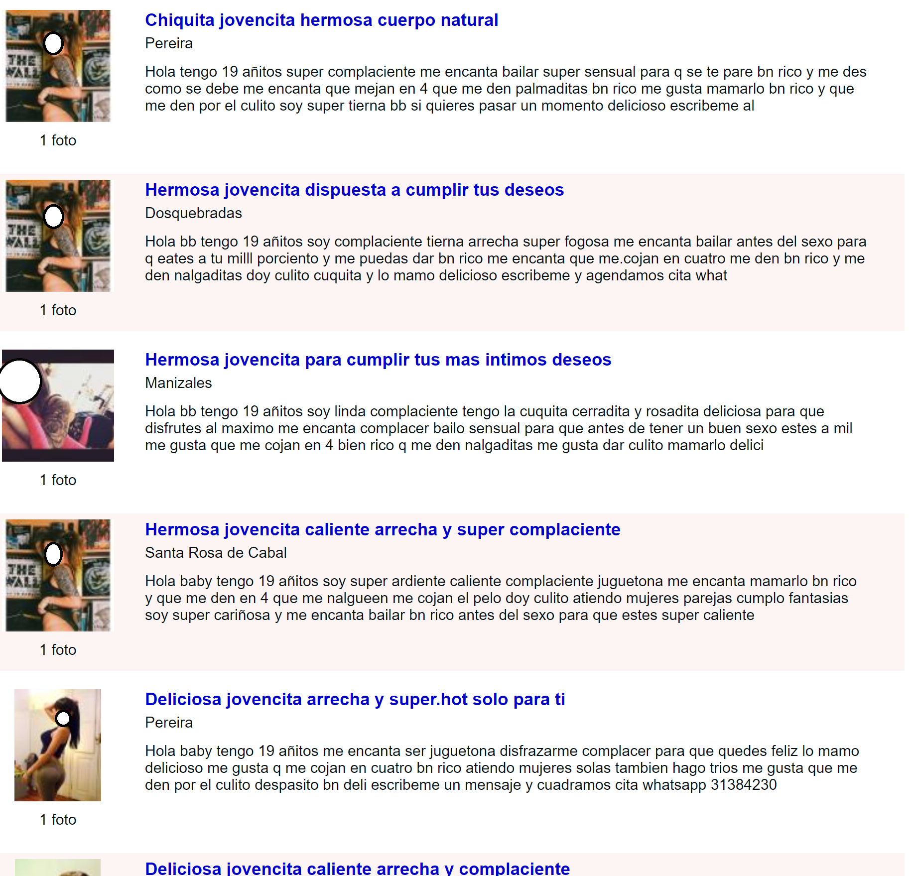 [align=justify][size=small]Les informo que el usuario Cristian292 de la Sala de Manizales, ha reportado una estafa por parte de una supuesta scort que se describe como una jovencita hermosa de 19 añitos. Cristian292 reporta que piden consignar dinero por adelantado para después bloquear a la persona. Los anuncios utilizados por esta supuesta scort están siendo publicados en ciudades como Pereira, Manizales, Santa Rosa, La Virginia y Viterbo. Por otra parte, es importante mencionar que dichos anuncios no siempre utilizan fotos de la misma mujer. [/size][/align]