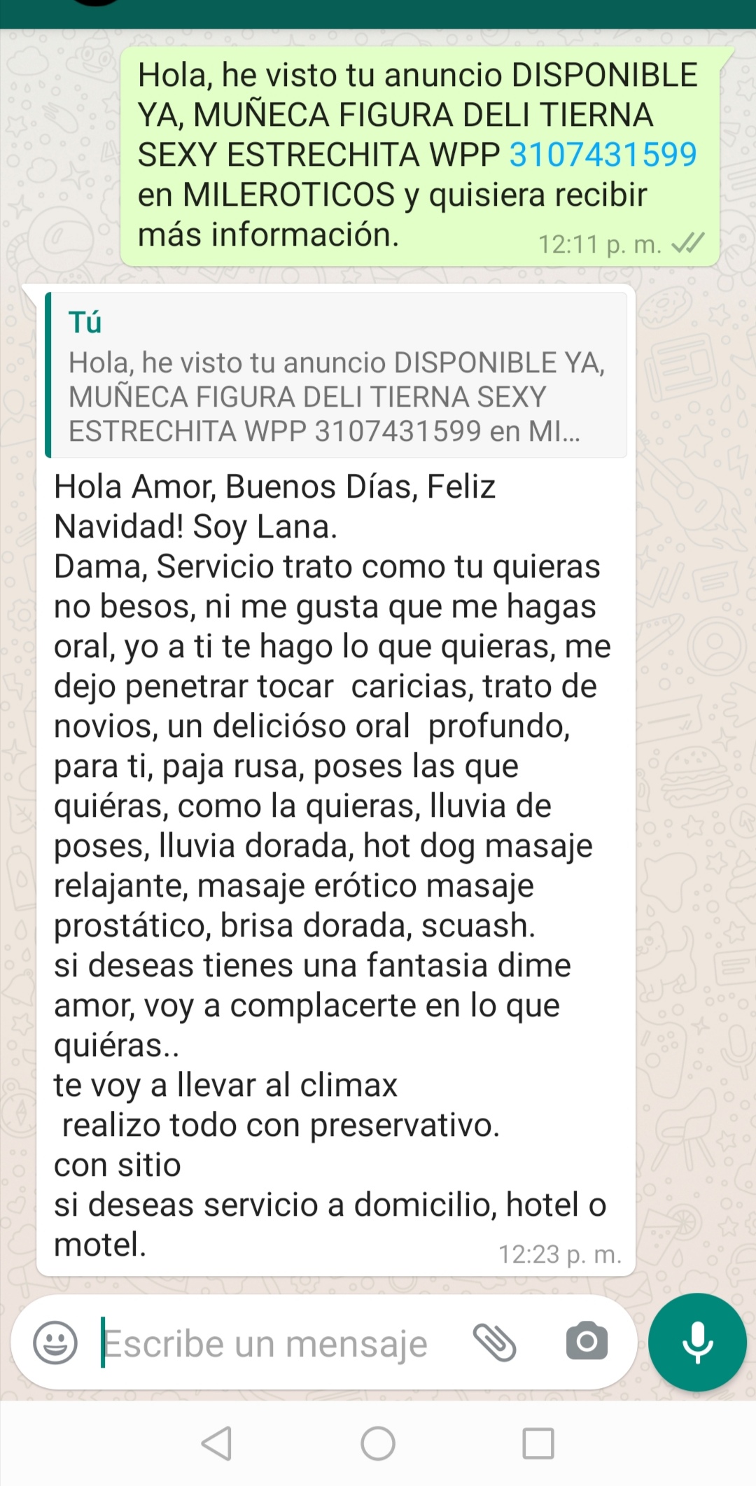 Amigos e estado ausente por el cov19 que sali positivo hace un mes largito asi que apenas den el visto bueno reiniciare mi mision puteril, por lo pronto les comento de la nena que la distingo vive cerca de mi casa es una flakita flakita reflaquita sin nada de carne bajita, bueno la verdad no le veo mucha gracia por que no me gustan las flacas tan flacas aqui te dejo lo me contesto, recuerdo que me a pedido 170mil,150mil y 180mil las veces que me a picado por escribirle pero me parece costoso lo que pide les repito me gustan voluptuosas y operadas asi que no me animado espero te sirva en ealgo mi aporte