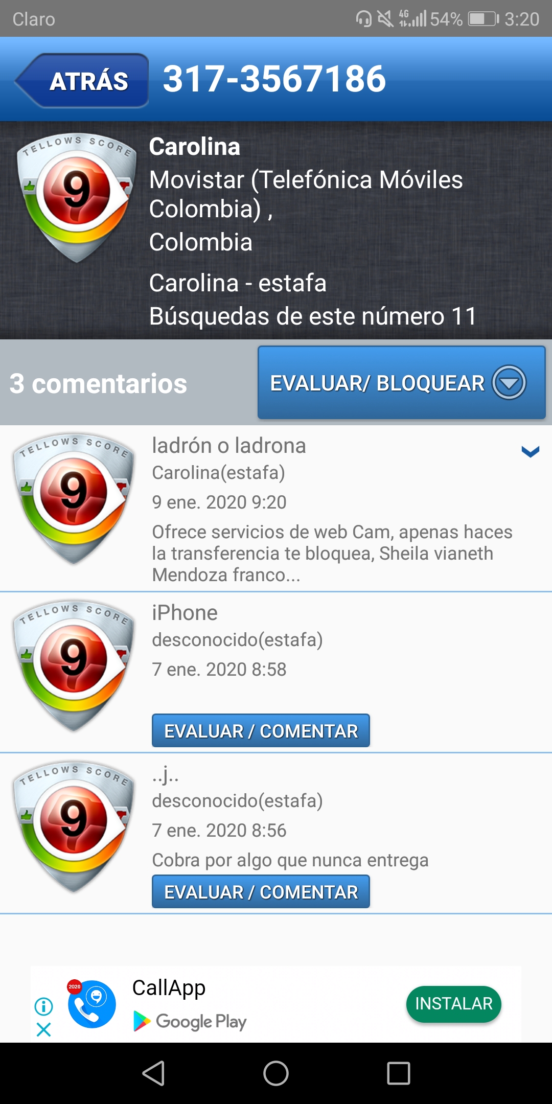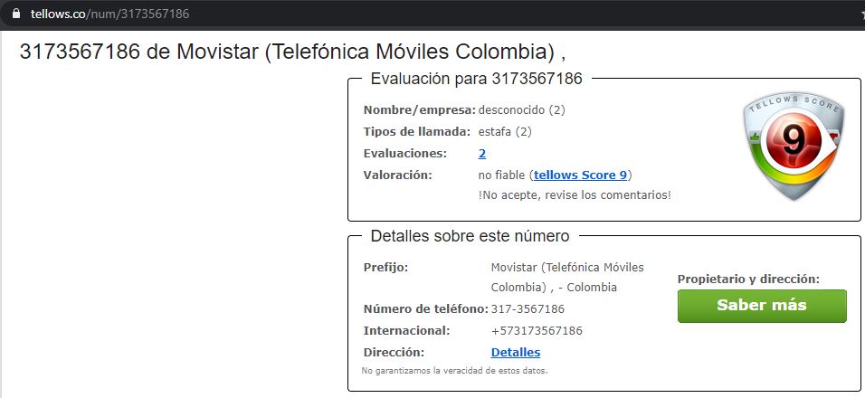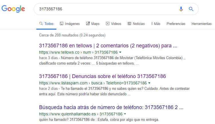 2. Buscar referencias sobres el número: En este caso, ese número 3173567186 está reportado como estafa.