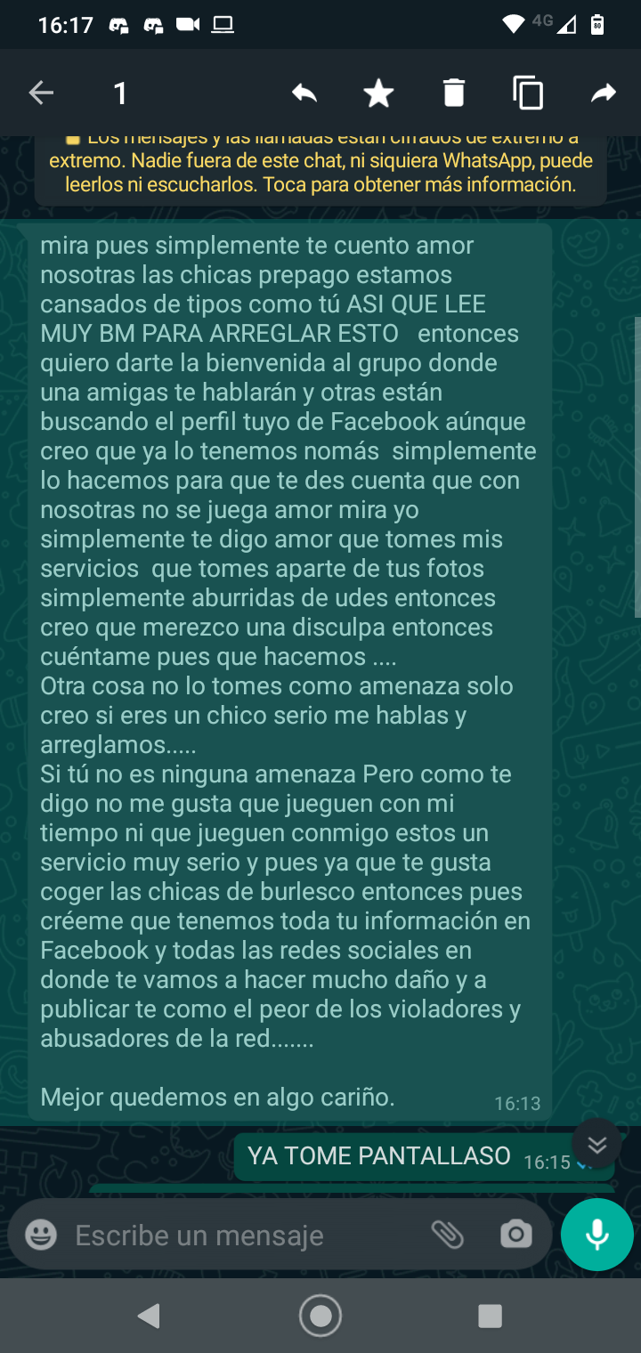 Hoy un número me escribe para extorsionarme, les dejó pantallazo de las conversaciones y anuncio tengan cuidado, que por lo que pude observar se dedica a esto, en mi caso no tengo fotos publicadas y mi foto de perfil es otra, buena suerte y cuídense