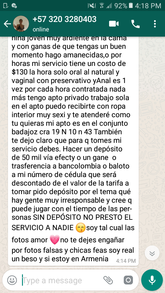 Me pareció muy linda en las fotos y pedí información y me dijo exactamente lo mismo, hasta que si le hacía transferencia bancaria el precio de todo el servicio me daba me daba descuento, que truco tan barato y viejo, todas las que piden consignación por adelantado es obvio que es un robo.