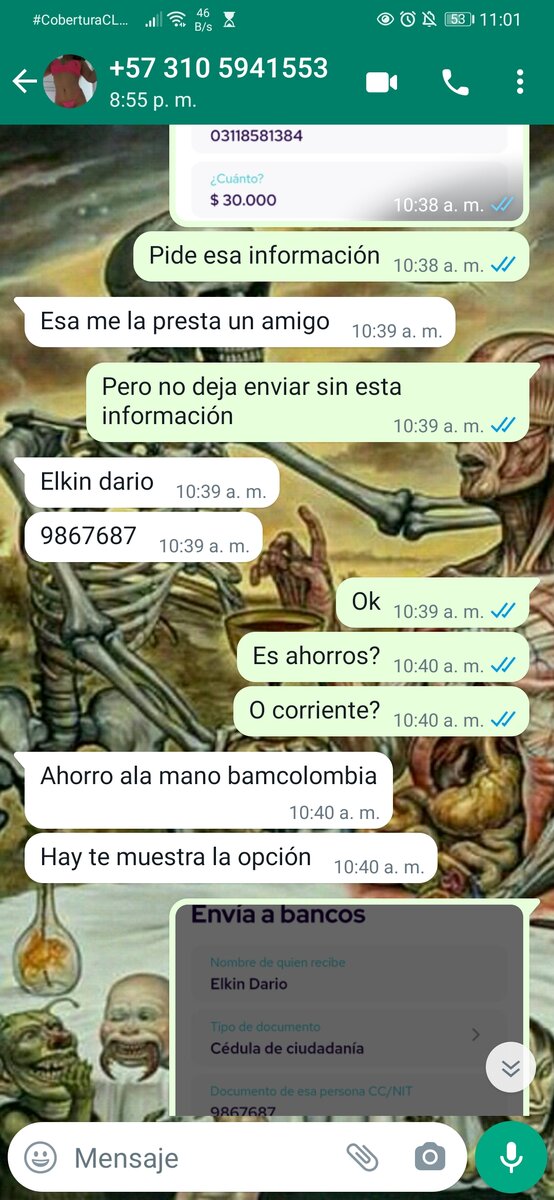 Contacte a esta scort por medio de MILEROTICOS y se acordó la compra de un pack de fotos y videos ya que no estaba interesado en servicio presencial y la chica solicitó 30.000 por este servicio, no le vi inconveniente y le pedí los datos necesarios para la consignación, me dio los datos de un supuesto "amigo " que le prestaba su cuenta bancaria para el deposito, aclaro que lo hice porque la chica presta servicio presencial, entonces era mas confiable que no fuera hacer este tipo de cosas, le realice el deposito al señor elkin Darío identificado con el numero de cedula 9867687, y con cuenta bancaria bancolombia numero 03118581384, ha de ser muy amigo de ella para que le presente su cuenta a esta chica para recibir este tipo de dinero, la cosa es que esta chica era acosando preguntando que si tomaría el servicio, le envié la consignación y nunca envió nada, esto fue el día de hoy en la mañana y ya transcurrió todo el día y no respondió ante la petición, es super gracioso que arruinen su imagen por 30.000 pesos