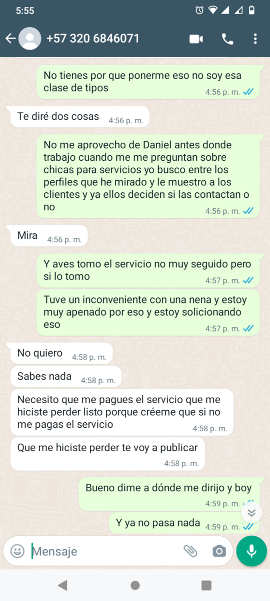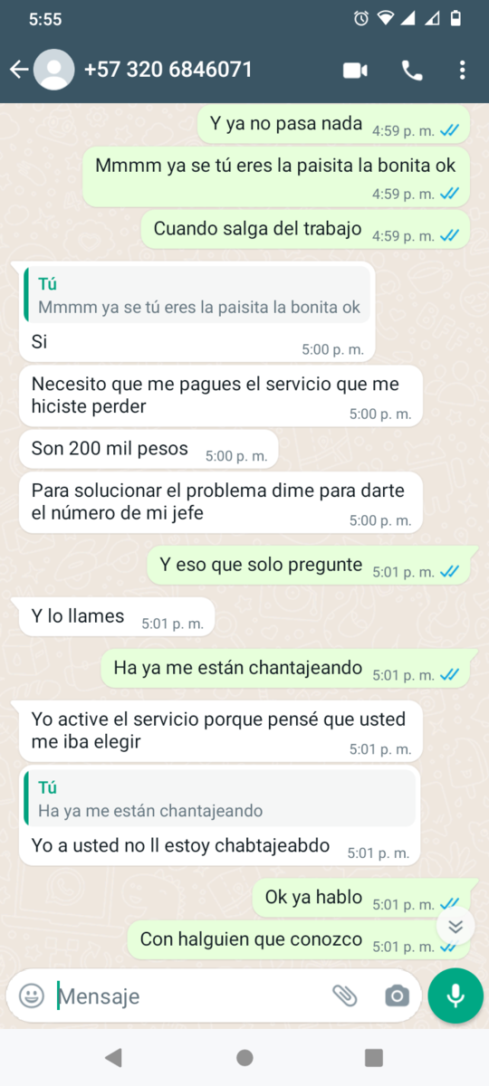 Hola buenas tardes colegas catadores les vengo a comentar un inconveniente que tuve el día de hoy con un servicio al cual estaba recomendando a la persona que es lo recomendé obviamente no lo tomo y la persona del servicio me llama a exigirme $200.000 que por el servicio que perdió que yo tengo que pagárselo y me amenaza y me chantajean baja bajo amenazas de publicar por presunta violación igualmente dejo el número disposición de la página y ya hice la respectiva denuncia en la fiscalía se llama Mónica desde Medellín y el enlace ya lo quitaron de la página +573206846071 este es el número
