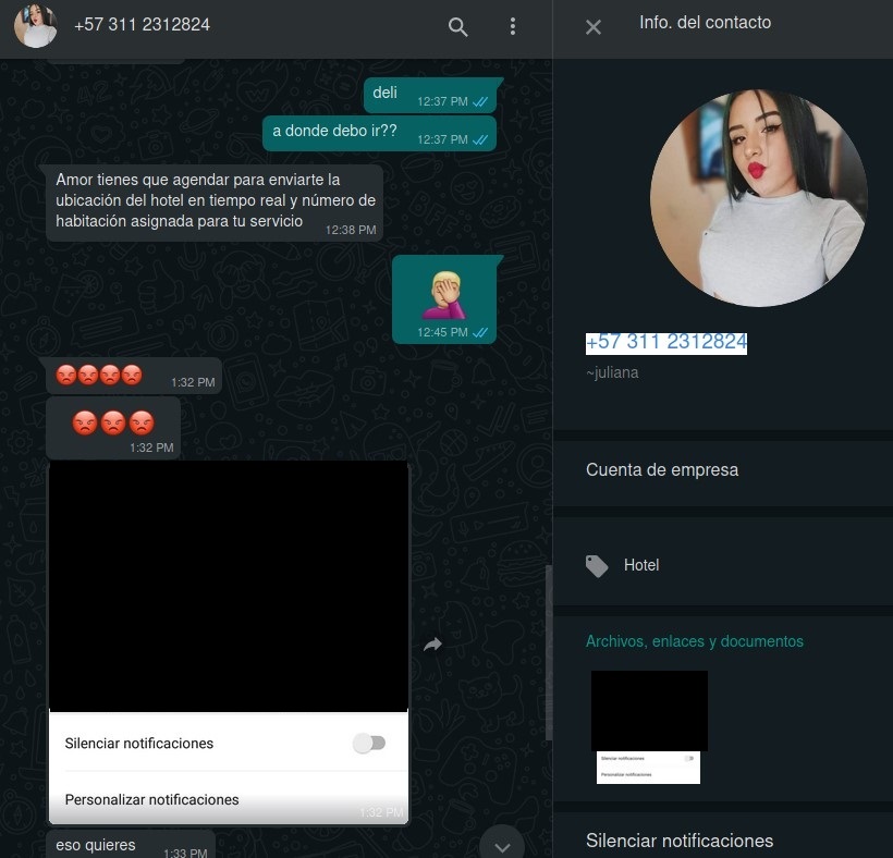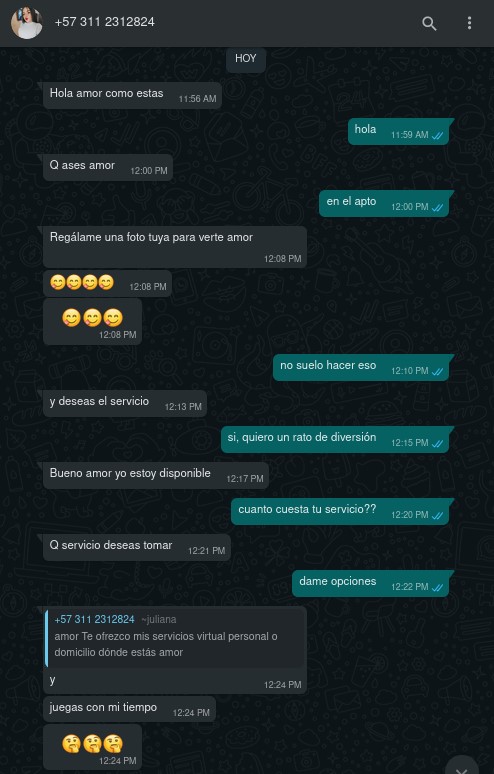hace unos dias contacte al telefono del anuncio para preguntar por servicios. hoy me escribe nuevamente a pedirme foto y ofrecer servicios de nuevo. pide reserva por adelantado, una estafa. como no respondo me envia mi imagen de perfil mio amenazando con publicar que soy violador.