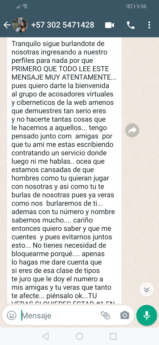 Buenas noches amigos, he visto estas situaciones en otros foros y por aquí estoy publicando mi experiencia... Tengan cuidado con el número 3025471428, dejaré anexado tanto foto como los mensajes que me mandó, parece ser una nena muy linda pero con esto me sacó de órbita y me hizo pensar que mas podría hacer...