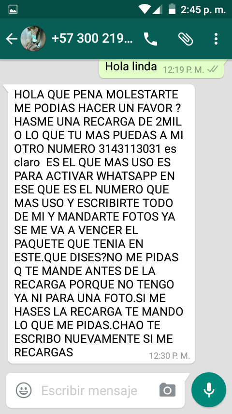 Contacte este link.  https://m.co.mileroticos.com/escorts/paola-sexosa-sin-limites/7417070/       la vieja se veía buena pero apenas le envió un mensaje me dice hola buenas puedes hacerme una recarga. Ahí les dejo con foto porque pueden cambiar de link o eliminar la publicación