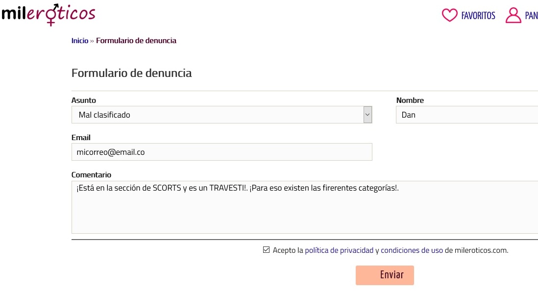 Por tal motivo los invito para que todos los que lean este mensaje y hagan parte de la comunidad, realicen la respectiva denuncia en los diferentes anuncios de travestis y "manes" que se publican como SCORTS, ya que va en contra de los términos y condiciones del sitio (MILERÓTICOS)