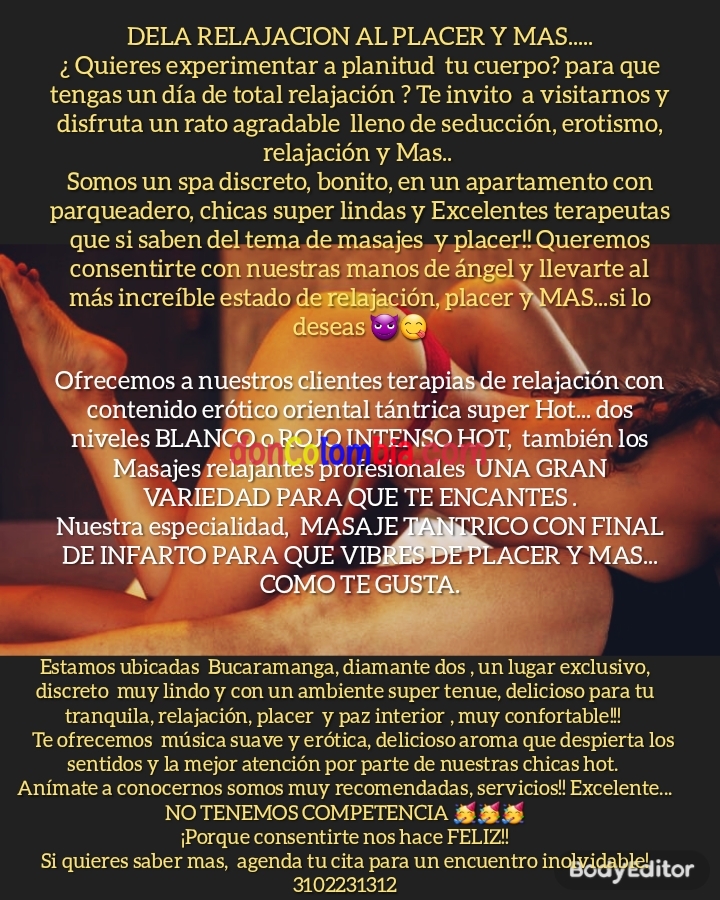 Somos un spa discreto, bonito, en un apartamento con parqueadero, chicas super lindas y Excelentes terapeutas que si saben del tema de masajes y placer!! Queremos consentirte con nuestras manos de ángel y llevarte al más increíble estado de relajación, placer y MAS...si lo deseas