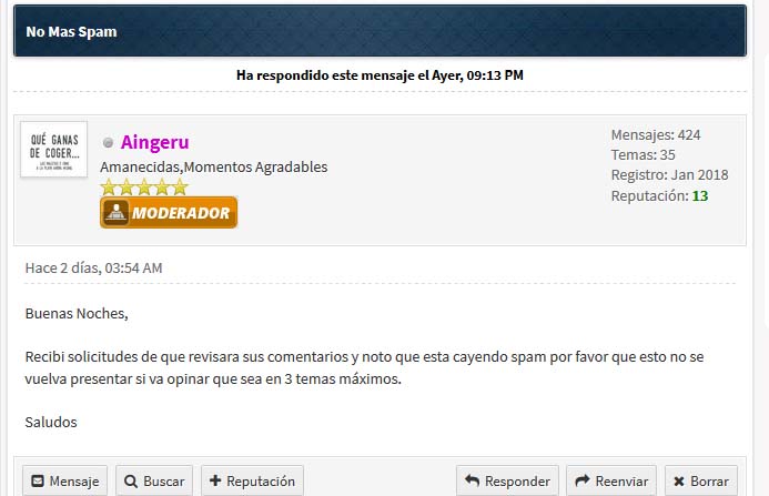 [align=justify]lo del spam es cierto yo veo mucha gente haciendo spam diariamente y a mi este sujeto me envio un mensaje que solo podia hacer tres comentarios diarios me desprestijio la reseña de grey y aparte me elimina los comentarios que pasa aqui entonces en este foro? cual es la maricada entonces que el administrador leonidas quien es el que ha llevado el caso me diga si es mentiras pues donde esta la liberta de exprecion entonces ?? la verda es asi mijo no se puede tapar [/align]