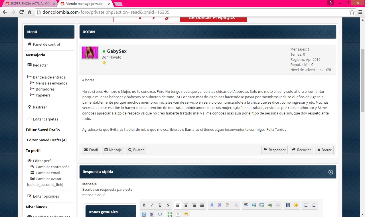 Pues yo siempre leo de vez en cuando esto desde que elimine la otra cuenta Gabriella Algo que ni recuerdo, me causa hasta gracia lo que escriben. No me afecta en nada lo que dicen pues publicidad buena o mala siempre es publicidad, y pues ante todo yo si soy una Dama y no ando hablando de nadie y que suban fotos que no son mias, o mias o de otras o que digan que yo soy o no soy, que me inventen nombres o insulten me da lo mismo. La verdad creo que no le hecho nada malo a nadie y los Clientes que si me conocen saben que conmigo La clase , el Aseo y la buena Atencion ante todo.