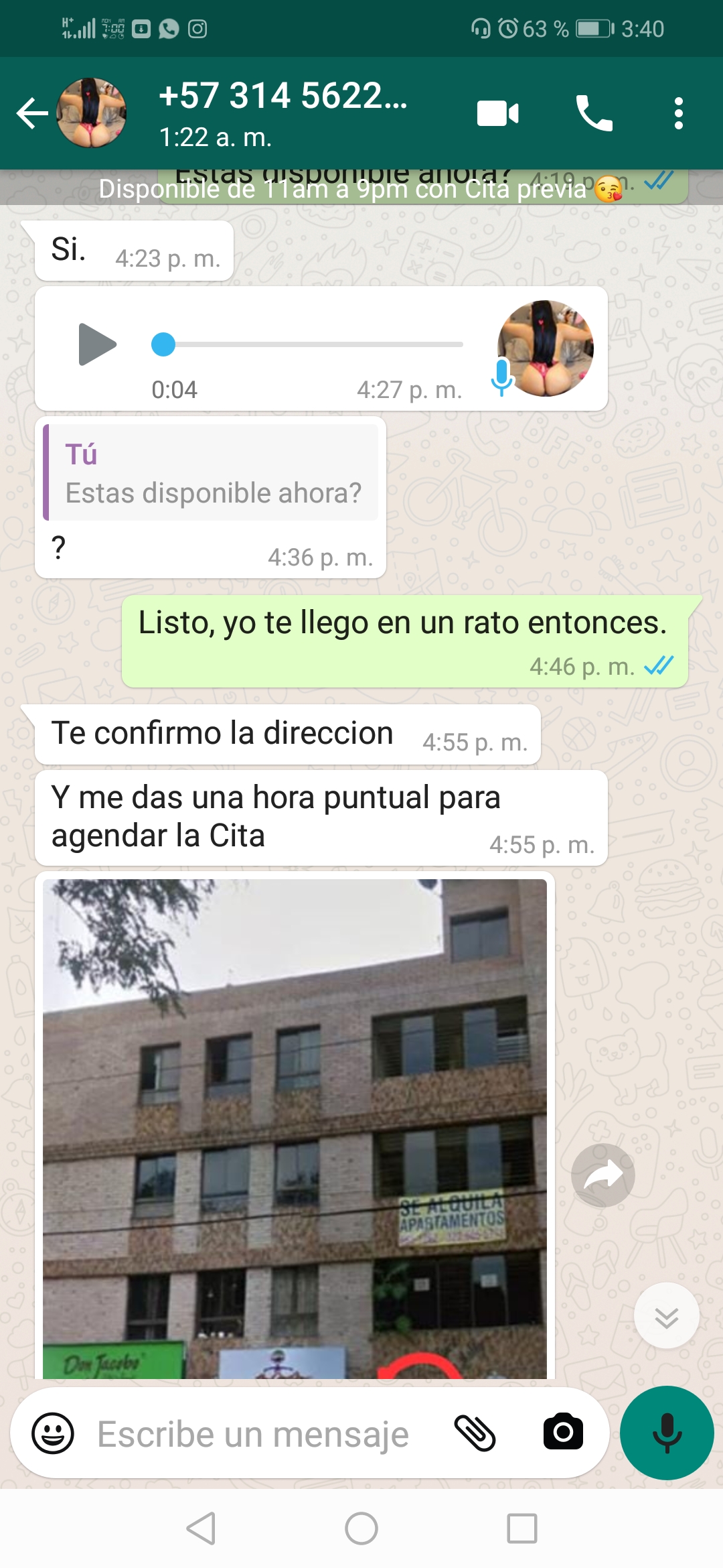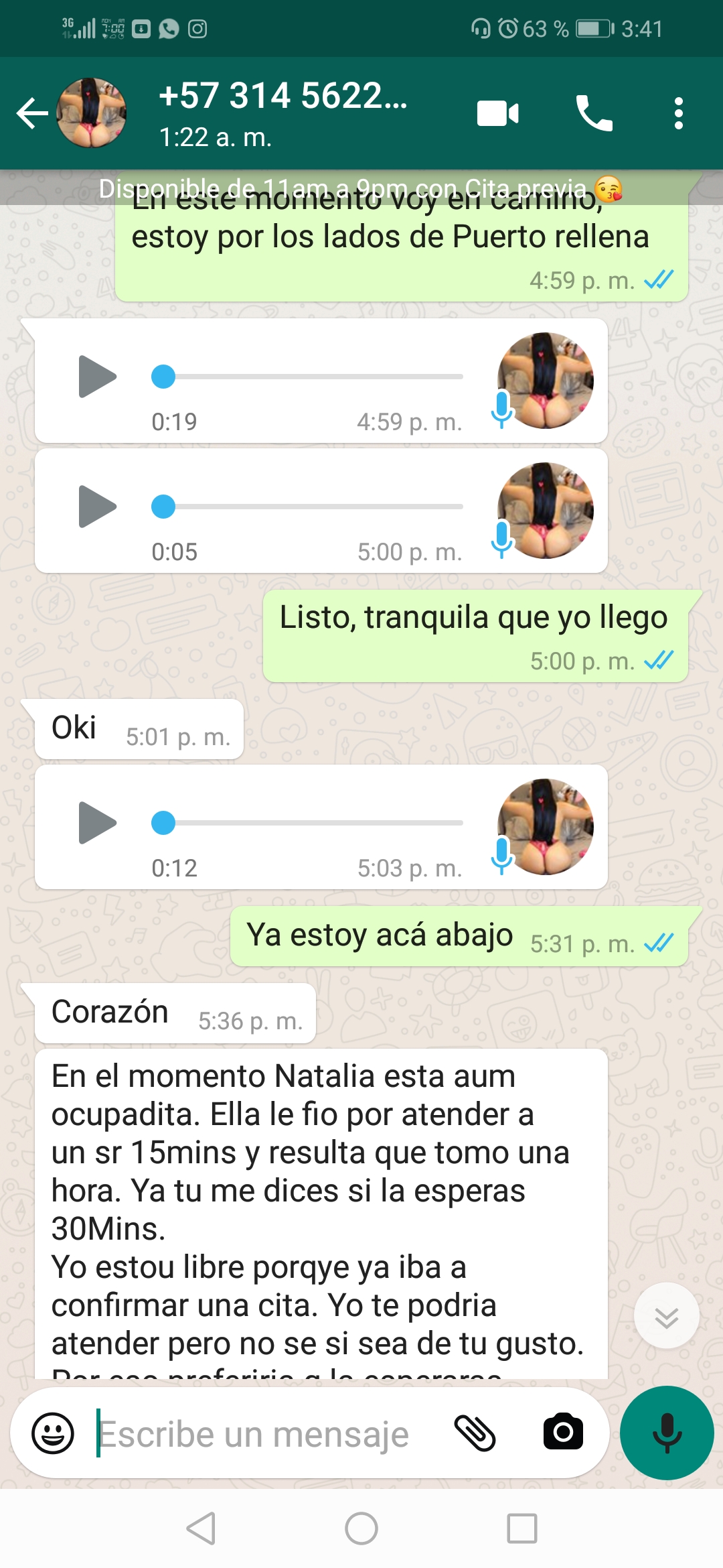 Hace 15 días la contacte y le pregunte si estaba disponible a lo que me dijo que si y que entonces le dijera que si iba a ir para esperarme, le dije que si que en un rato le llegaba, me dio la dirección con foto del edificio, le dije que estaba por los lados de Puerto rellena, me dijo que si por algún motivo no podía llegar entonces que le avisara por que ella era puntual y le gustaba que la gente también lo fuera y que muchas personas sacaban cita y no llegaban y adicionalmente la había llamado otra persona preguntándole si podía arrimar al apartamento pero ella ya me había agendado, en fin me dio el número de apartamento para que lo mencionara al portero,30 minutos después llegue al sitio le pregunté al portero, el llamó y casi que no contestan, después de un rato contestaron y oh sorpresa, me dice otra chica que no era Natalia que ella pensó que yo no llegaba y entonces recibió a otro cliente, que si la podía esperar 40 minutos y me atendía (que descaro) obviamente le dije que no y que me parecía una falta de seriedad que me hubiera hecho ir hasta por allá para salirme con esas,colgué entonces y me llego un WhatsApp donde me decía que Natalia estaba aún ocupada por que había atendido a un señor 15 minutos y resultó pagándole al final una hora