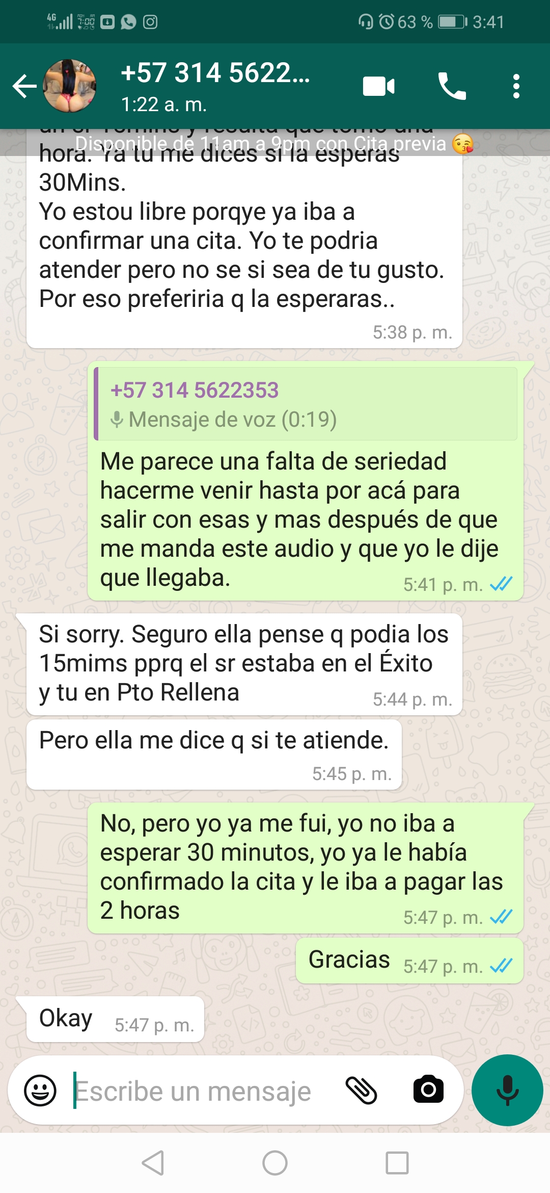 , que si la esperaba 30 minutos (ya le mermó 10) o que si quería ella me podía atender que estaba libre, le dije que no que ya me había ido y nuevamente le mencioné la falta de seriedad por haberme cancelado aún con una cita ya fijada.