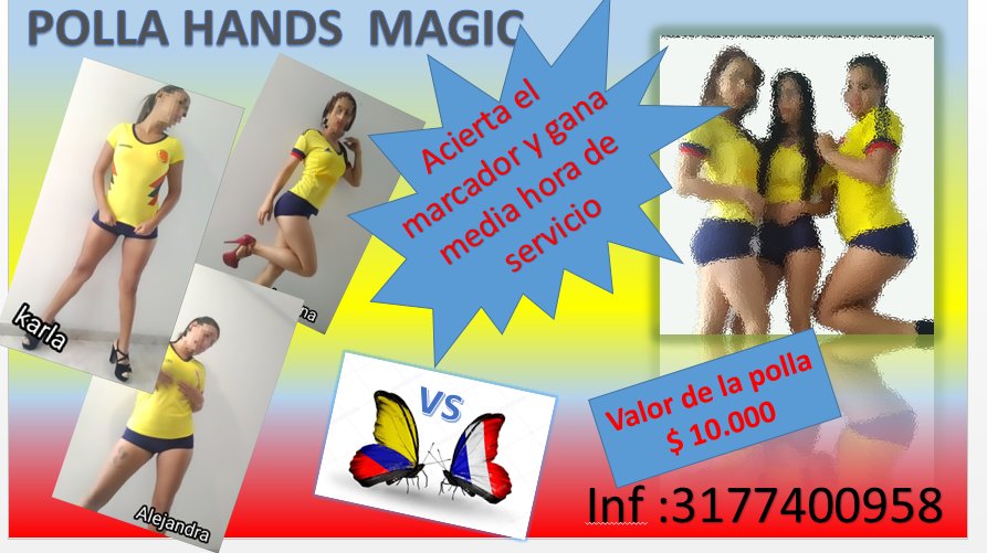 HANDSMAGIC REGISTRADO 23 MAR 2018 #1 HOLA VEN Y PARTICIPA EN NUESTRA POLLA DEL DIA DE HOY ACOMPAÑANDO A NUESTRA SELECCION GANA CON NOSOTRAS DE UN SERVICIO GRATIS POR TAN SOLO APOSTAR 10.000 MIL PESOS A TU EQUIPO GANADOR ... LLAMA PARA MAYOR INFORMACIÓN 3177400958 Archivos Adjuntos pollla.PNG 510,8 KB · Vistas: 556