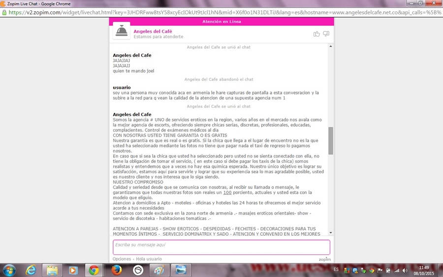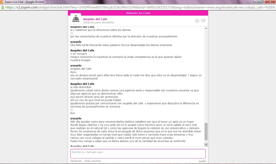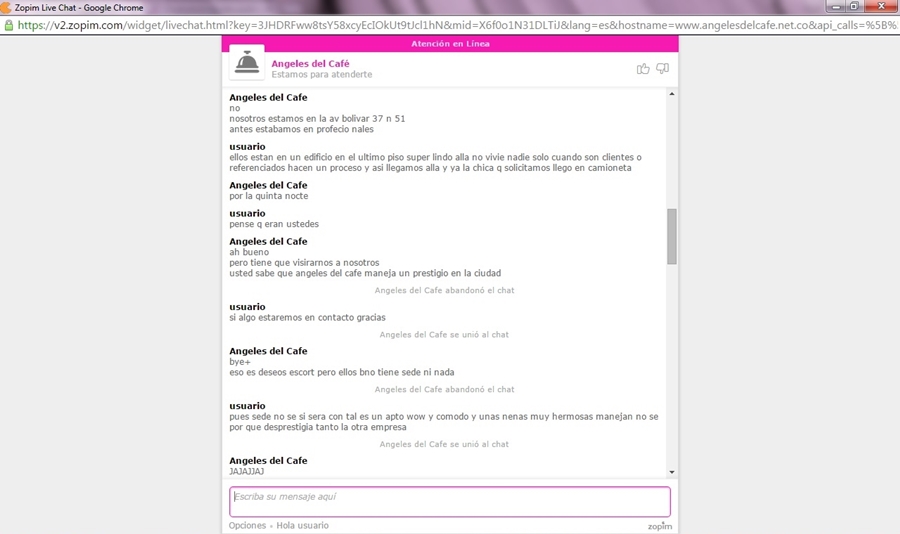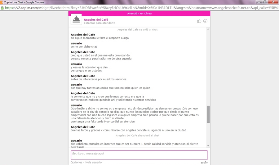 Hola buenos dias en ningun momento los ataque yo he sido cliente de ellos y he contratado varios servicios y la verdad angeles del cafe con todo el respeto ha bajado mucho de nivel las chicas de profesionales eran muy lindas nada que ver con estas de estas de ahora se salvan 2 o 3 paso seguido la guerra se ve que la inician ellos y si no comuniquesen por telefono con las demas agenbcias que ninguna mas desprestigia