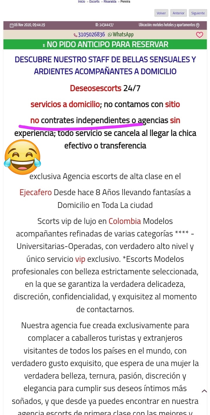 por si aun hay hombres que creen en el cuento de que las agencias les ofrecen mujeres VIP exclusivas e inalcanzables igual para mi no es nada nuevo esto ya lo se desde hace años en armenia y recien llegue a pereira con el manager edwin que semanas despues vi en mil eroticos chicas de el casi a mitad de precio yo soy un feroz opositor de que terceros se lucren a costillas de las chicas si me molestaba antes de la pandemia ahora con mayores veras por el inpacto negativo en la economia no estamos para llenarles el bolsillo a agencias y chulos ''managers'' solo por responder el whatsapp y cuadrar una cita pudiendolo hacer nosotros mismos con ellas es mas que sentido comun con la comicion del manager se cata otra chica mas bien.