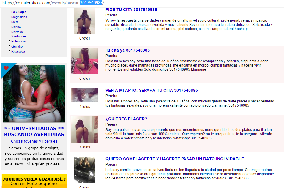 Alguna referencia de las nenas que atienden al celular 3017540985 :huh: https://co.mileroticos.com/escorts/buscar-3017540985/ noto que son varias, entonces no se si es una agencia, una estafa....