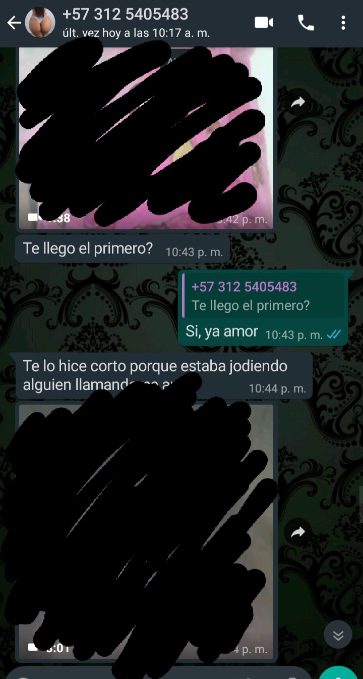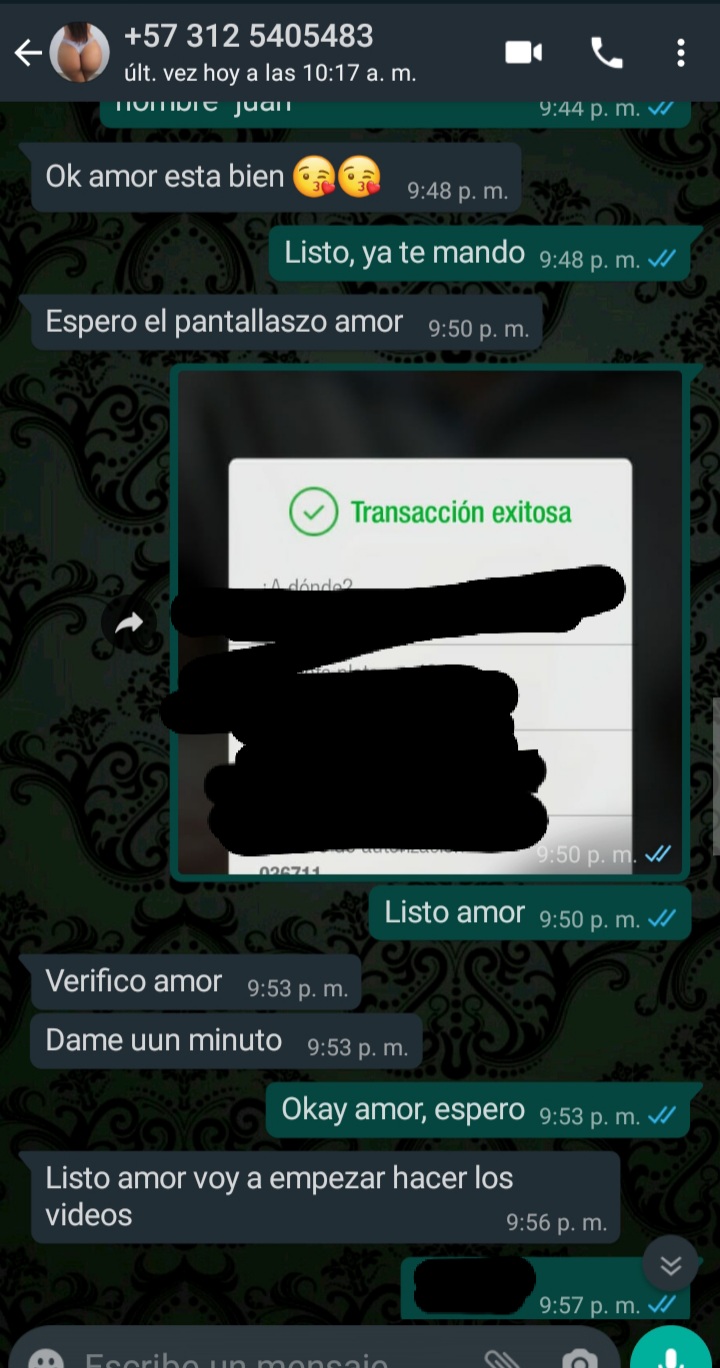 11) Comentario general: Primera vez que tomo un servicio virtual, pero donde estoy pasando la cuarentena no hay nada que catar, le escribi y me parecio curioso que no respondiera con el clasico mensaje largo que envian a todos, le pregunte por tarifas, que tenia videos, fotos etc. Al final pedí confirmacion por videollamada y en efecto me mostró un rato que si era ella, le confirme cual de sus paquetes queria y que queria que hiciera y le mande el dinero, en un principio sabia que podia robarme y ya, me bloqueaba y adios plata, pero me confirmo y me dijo que esperara... se demoró como 20 - 25 min y en efecto me envio lo que pedí. Me gustarón los videos lo unico era el audio, pero ella misma me dijo que el audio siempre era un problema, aun asi disfrute los videos y si alguno esta interesado pues al menos puedo confirmar que si cumple y no se roba la platica, ademas es la de los anuncios.