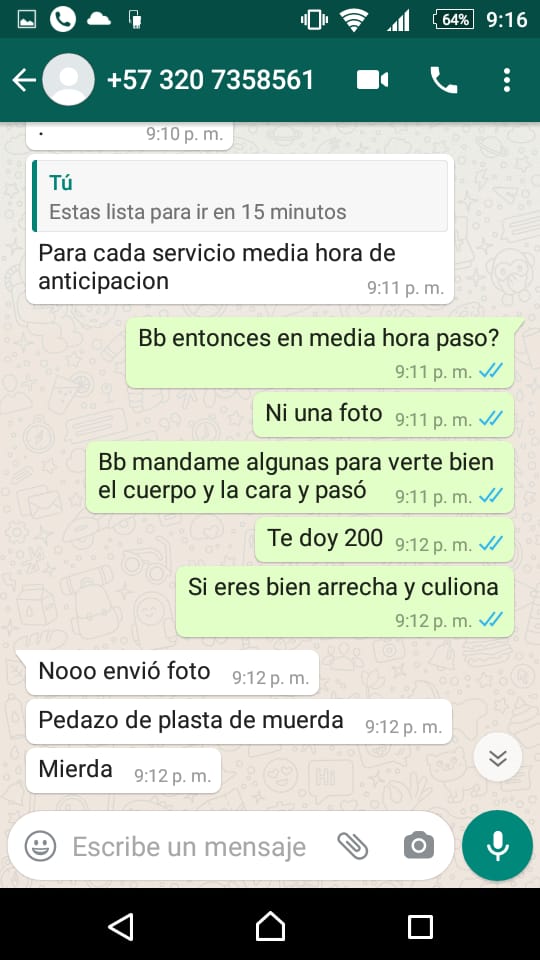 Bueno hace mucho tiempo vi las fotos y la pelada me gustó quedamos y fui al apto del laguito que trabajaba allá. Me abrió la puerta y se veía bien no muy linda de cara pero de cuerpo linda. El problema desde que ingrese fue ella es muy fría y relojera. Ni saluda y lo hace pasar a uno y se quita todo rápido y ni le gusta que la toquen. Como dije fue el peor sexo oral que me han hecho lo hace con asco y se la pasa limpiando y escupiendo en pañitos. Aclaro que lo siempre voy limpio y depilado así que no fue eso. Entonces empezamos la faena ese culo y piernas con muy ricas pero su actitud daño todo. No le gusta que la toquen no se mueve nada y hasta se la pasa pegada al teléfono contactando el siguiente cliente mientras uno se lo tiene adentro. Esa vieja no se mueve esa cuca es muy seca y abierta se le notan los hijos. Mejor dicho me vine una vez dándole en 4 pero me Sentía sin ganas después la puse a cabalgar y nada lo mismo. Esa vieja no se mueve nada me toco hacerlo todo y me vine por segunda vez por no perder el dinero. Y cuando llevábamos media hora me dijo que ya iba a acabar el tiempo que ella lo contaba desde que la llamaba en la entrada del edificio eso me terminó de enojar. Mejor dicho me vestí y me sentí robado. Jamás he estado con una vieja tan amarga malgeniada y que se le nota que hace esto con asco y rabia.