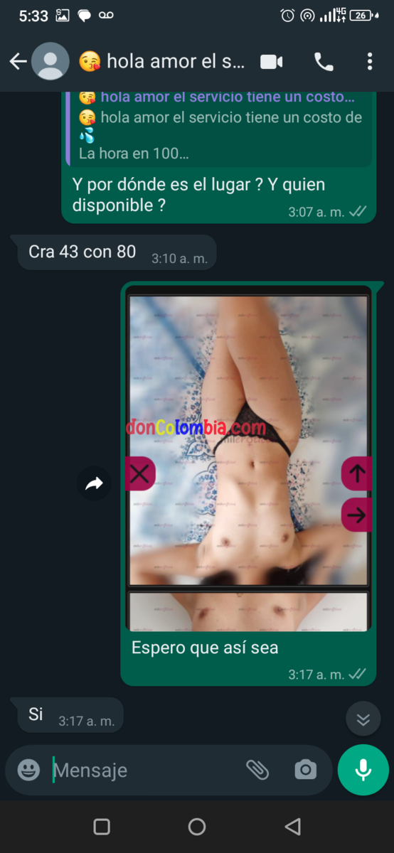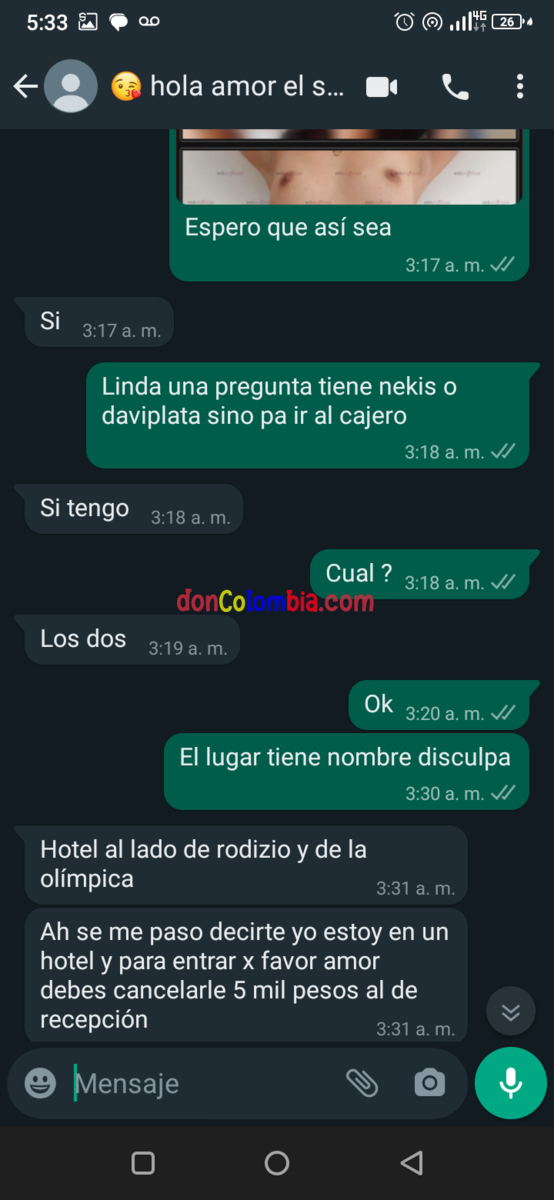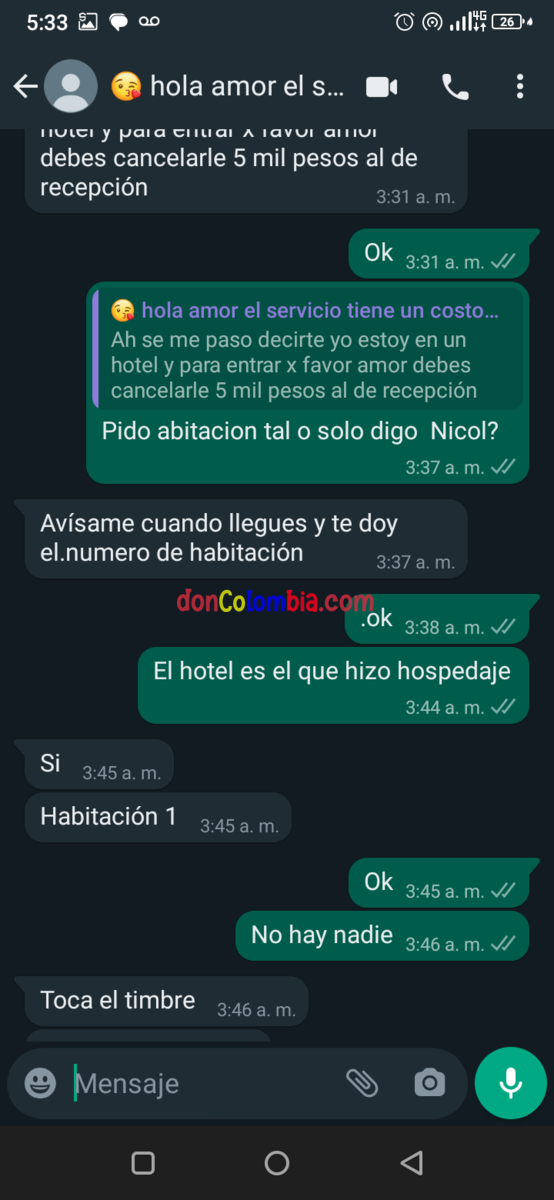 le pregunté, usted es igual que la foto, por lo menos, no son igual necesito que sea una flaca, que tengo ganas de comer flacas y me dijeron que sí entonces fui donde ellos. después me salieron diciendo que tenía que pagar peaje de $5000 al portero del hotel y ya cuando subo voy a ver ala muchacha, pero sale una mujer morena gruesa , y yo digo me jodieron perdí el tiempo y le dije bueno hagamos algo dame media hora ya para quitarme la arrechera entonces pagué, me dije a trabajar se dijo, aparte de la decepción que tenía encima la muchacha estaba un poquito