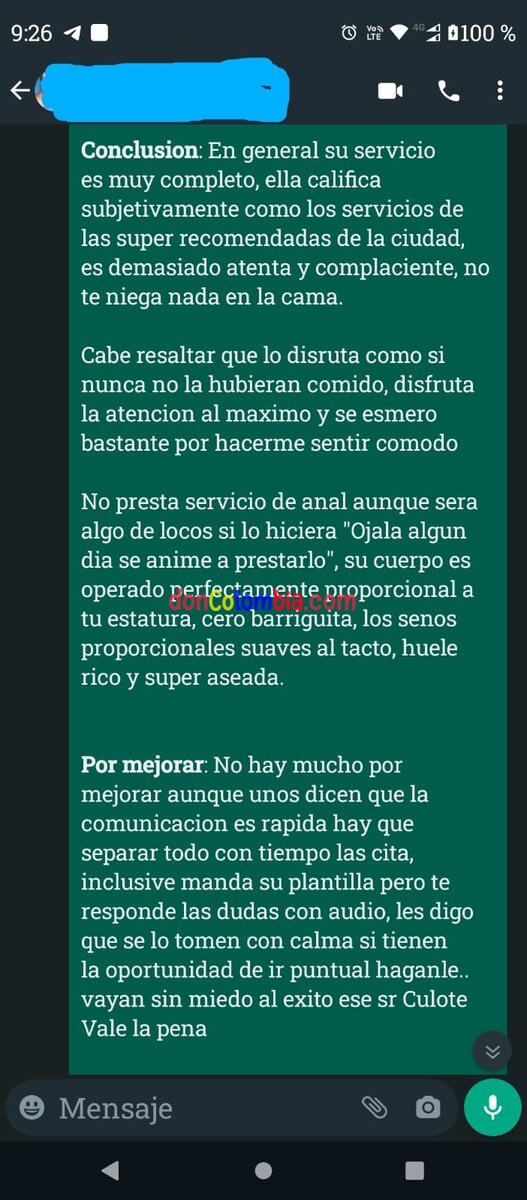 CONCLUSIÓN: En general su servicio es muy completo, ella califica subjetivamente como los servicios de las super recomendadas de la ciudad, es demasiado atenta y complaciente, no te niega nada en la cama.