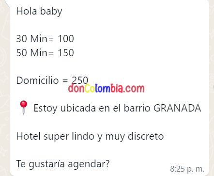 Hola cómo van puteros… esta nena la cate hace unos 4 meses, se ubica en un hotel del norte en la 6ta.. primer punto en ese momento me cobro $100.000 la media hora y pues al ver semejante bebé fui, deje el carro en el parqueadero del hotel y cuando entré o sorpresa que tenía que pagar $15.000 de peaje. Ya estaba ahí con el polvo en la cabeza y la curiosidad al 100, pague y subí.. esperé como 5 minutos y la nena me dejó pasar. La verdad la vieja está buena, y le pague, me hizo acostar, sacó un juguete y se comenzó a tocar el clitoris, después me colocó forro y comenzó a chupar muy básico, ya fierro se acostó y me le monté y comenzó como lo regular porque que no se deja besar, que no toque aquí no toque allá.