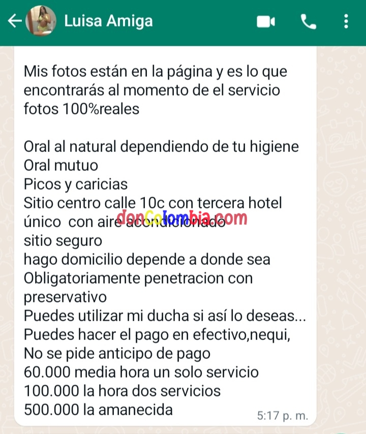 La tercera reseña es Luisa Fernanda con ella me paso algo particular mas delante se los digo, cuadre con ella en un motel llego y es una morena que de frente te vas a encontrar con su mejor atributo sus senos son muy bonitos es decir grandes pero paraditos piel tersa, simpática de cara tiene un trasero acorde a su cuerpo es muy buena charlando es mas senti que era tan buena hablando que parecíamos dos amigos hablando en un motel situación que es un poco extraña eso fue lo que me sucedió con ella, es mas creo que le dio pena conmigo porque quería apagar las luces de la habitación cosa que no me gusta mucho porque a mi en particular me gusta ver, en el acto me hizo un oral normal con preservativo cuando la iba a penetrar el condón estaba seco y le iba a echar saliva a lo que me dijo que eso la pelaba bueno la penetre asi seco y fue algo que se sentía no muy bien cuando estabamos en misionero me colocaba obstaculos para penetrarla toda, en esa posicion no pude llegar se subio encima y asi pude lograrlo, es decir me fue mucho mejor charlando con ella que en el acto, no creo que pueda repetir con ella o quizas si a ver si en otra oportunidad me vaya mejor. Me cobro 90k creo