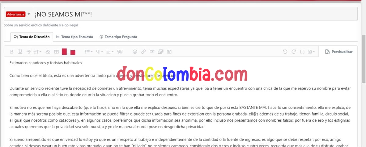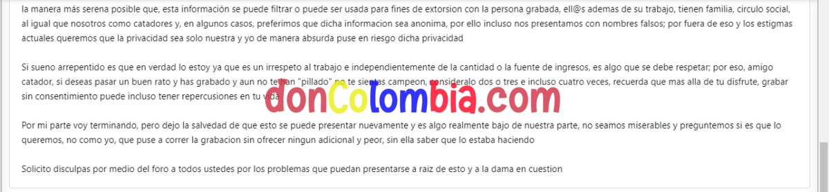El motivo no es que me haya descubierto (que lo hizo), sino en lo que ella me explico despues: si bien es cierto que de por si esta BASTANTE MAL hacerlo sin consentimiento, ella me explico, de la manera más serena posible que, esta información se puede filtrar o puede ser usada para fines de extorsion con la persona grabada, ell@s ademas de su trabajo, tienen familia, circulo social, al igual que nosotros como catadores y, en algunos casos, preferimos que dicha informacion sea anonima, por ello incluso nos presentamos con nombres falsos; por fuera de eso y los estigmas actuales queremos que la privacidad sea solo nuestra y yo de manera absurda puse en riesgo dicha privacidad
