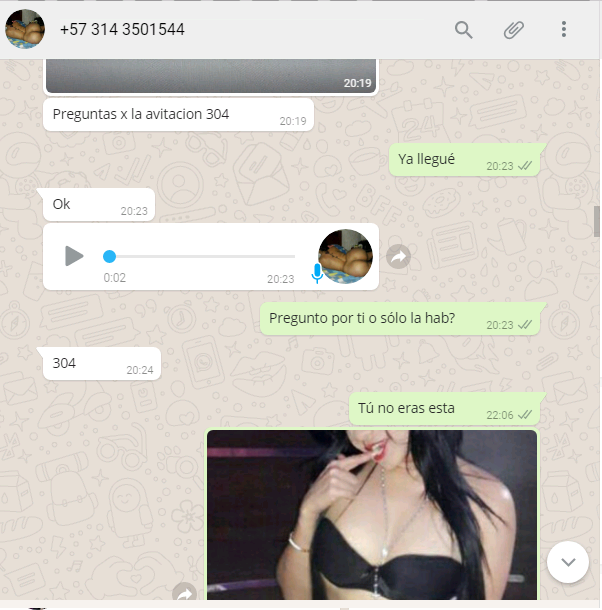 Después de eso, la persona que contesta desde ese número, como percatándose de que la había cagado, ofrece recompensarme, que fuera y lo compensaba, que ella siempre se equivocaba de cuarto, que la de ella era la 303 y no la 304. Yo le dije que no tenía tiempo en ese momento, pero entendí que la tal recompensa era ir y tener sexo por las molestias causadas (porque realmente fui estafado). Pues bien, parece que a la nena, cuando le dije que lo dejáramos para el jueves, perdió toda noción de la justicia y empezó a hablar mal de quien, supuestamente, es su prima me dijo "pagaste por la otra prepago (+18) y es fea, yo no soy fea;  y tengo mi mejor cuerpo (sic) y culeo rico y mejor que ella" lo que me hizo pensar inmediatamente que la tal "recompensa" no sería gratis, entonces le dije que me aclarara los términos  y después de pensarlo un rato me propuso que 80 por dos horas, cosa que no acepté porque al perro no lo capan dos veces.