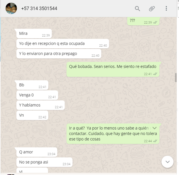 Luego, la recomendación es, tengan cuidado compañeros. La nena en un principio me dijo que estaba ocupada y que por eso me había enviado con otra prepago, pero luego me dijo que confundía las piezas.  Entonces, qué maricada. Lo más seguro es que están de acuerdo entre ellas y pues, a mí me tocó perder.