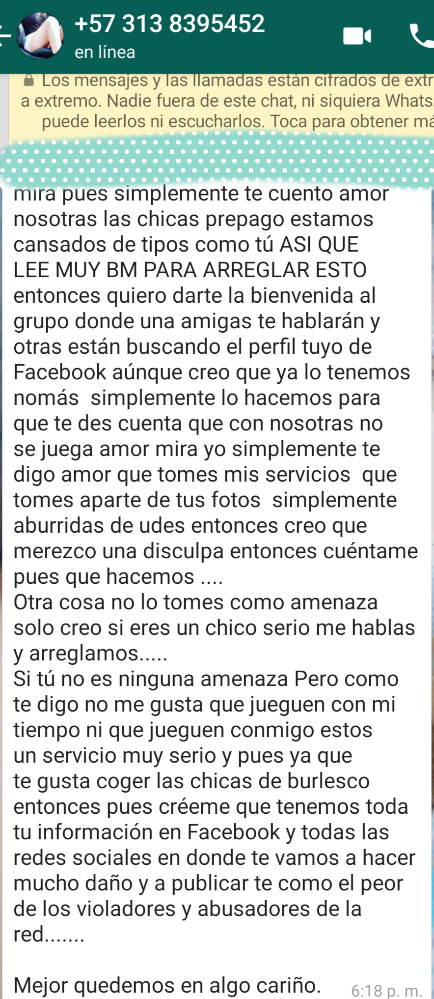Ojo con este número que esta enviando esas amenazas todas pelles no falta el que caiga, ustedes les ha llegado?