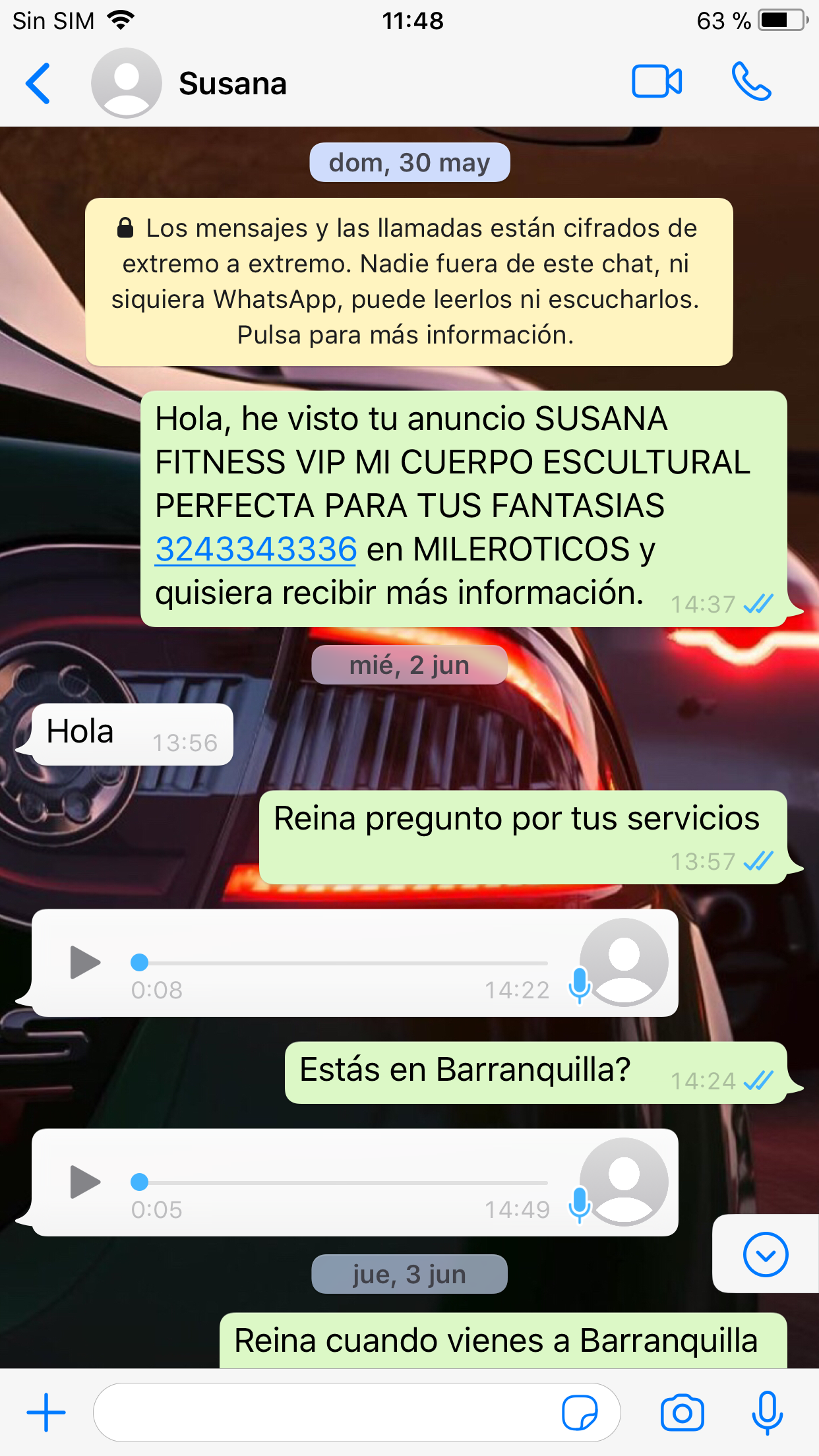 Compañeros catadores hay un dicho que dice que soldado avisado no muere en Guerra esto es un llamado urgente para que no tomen ese servicio se llama Susana es nueva acá viene de Cartagena yo una ves le escribí hace mucho pero me contestó y me dijo que no trabajaba es Barranquilla le hablé como 3 veces una de esas veces fue que ella me pidió un favor que le buscara el valor de un hotel y otra que ella misma me escribió para saludarme bueno paso el tiempo no le volví a escribir hasta hoy casualmente le escribo hoy y me dice que está en Barranquilla me dio sus tarifas yo le dije que iba el sábado y le pregunto si acepta besos y sexo oral mutuo lo cual se molestó ella me comenzó a insultar a mi a todos los costeños yo le tranquila yo pregunto que se puede y que no siguió que no iba a atender y insultándome sin motivos para mi yo la bloquie y escribió desde otro número mandando captura de las conversaciones y insultando la bloquie también de hay muchachos cuidado con esa mujer es grosera esa go*** y sin motivos se pueden ganar un problema ustedes saben los lambones en caso de vallan y pase algo van a salir perjudicados https://co.mileroticos.com/escorts/...a-desfrutar-do-meu-corpo-3243343336/21407543/