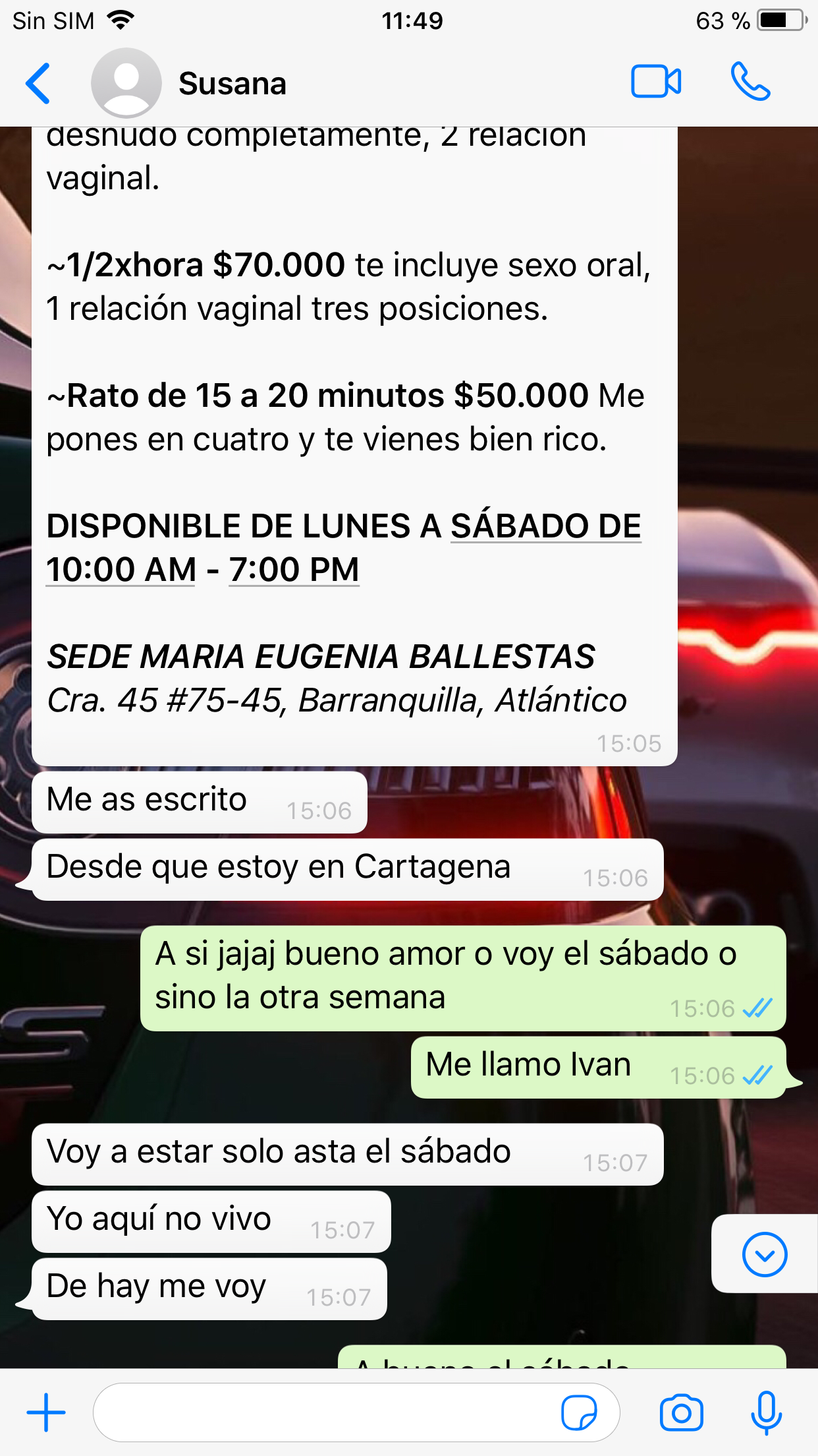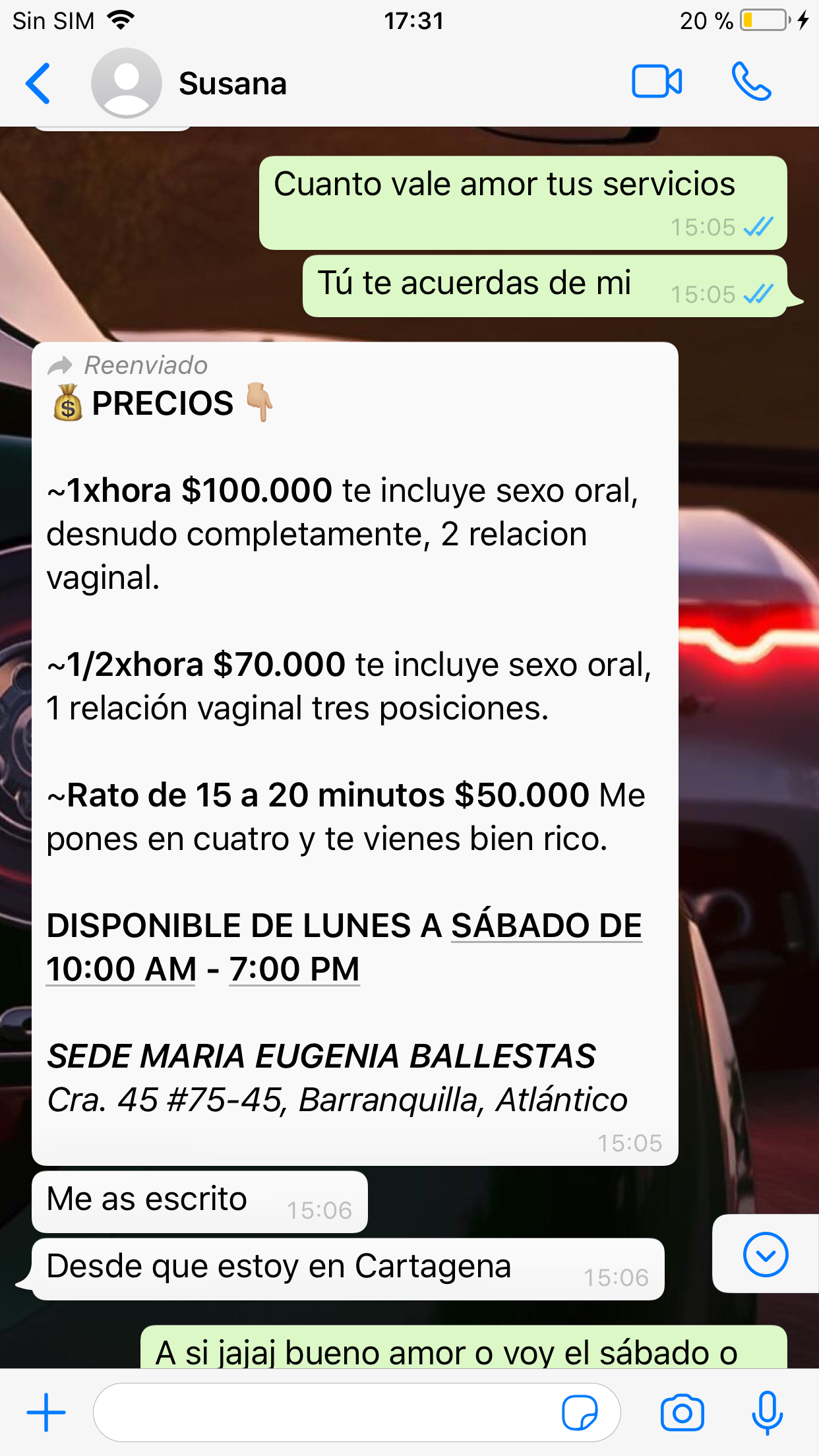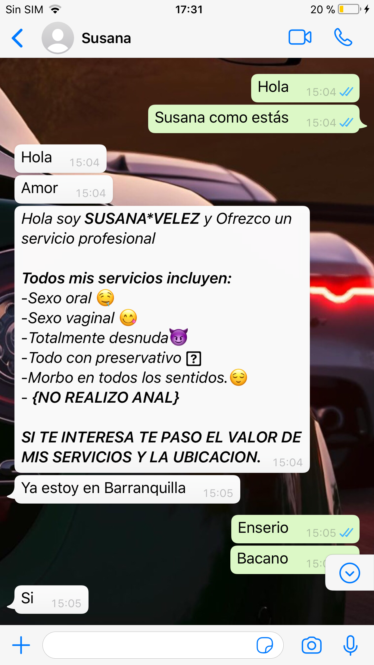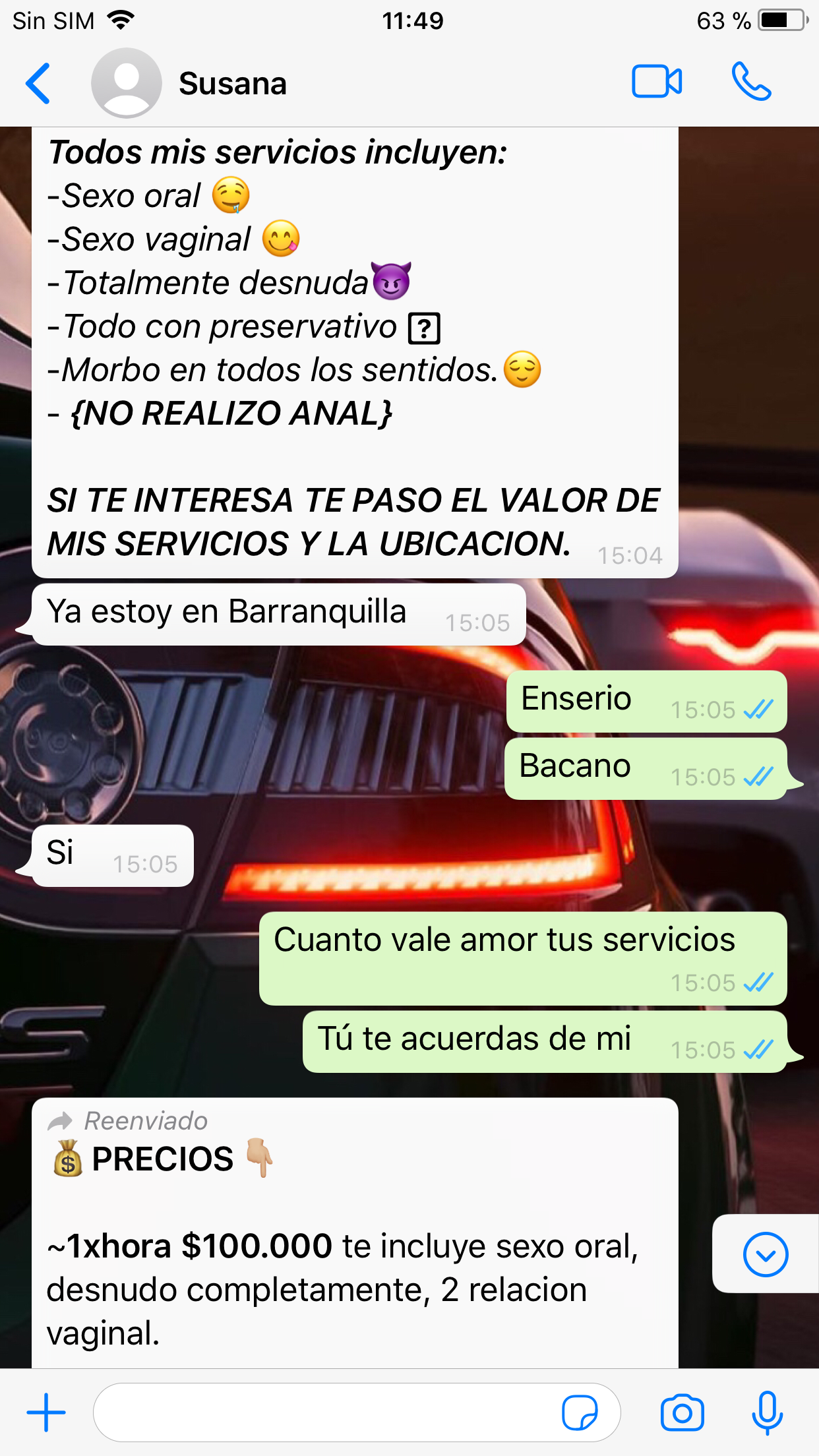 Compañeros catadores hay un dicho que dice que soldado avisado no muere en Guerra esto es un llamado urgente para que no tomen ese servicio se llama Susana es nueva acá viene de Cartagena yo una ves le escribí hace mucho pero me contestó y me dijo que no trabajaba es Barranquilla le hablé como 3 veces una de esas veces fue que ella me pidió un favor que le buscara el valor de un hotel y otra que ella misma me escribió para saludarme bueno paso el tiempo no le volví a escribir hasta hoy casualmente le escribo hoy y me dice que está en Barranquilla me dio sus tarifas yo le dije que iba el sábado y le pregunto si acepta besos y sexo oral mutuo lo cual se molestó ella me comenzó a insultar a mi a todos los costeños yo le tranquila yo pregunto que se puede y que no siguió que no iba a atender y insultándome sin motivos para mi yo la bloquie y escribió desde otro número mandando captura de las conversaciones y insultando la bloquie también de hay muchachos cuidado con esa mujer es grosera esa go*** y sin motivos se pueden ganar un problema ustedes saben los lambones en caso de vallan y pase algo van a salir perjudicados