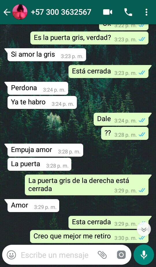 Sobre otra mala experiencia, hablé con una chica que se hace llamar Adriana, ella me dijo que le informara al yo llegar a cierto sitio para después decirme el lugar exacto al que tenía que ir, al llegar le di la noticia, pude ver que vio el mensaje en las notificaciones (los dos chulos en gris), y de ahí, los mensajes siguientes ya no llegaban (un chulo en gris), al parecer desconectó la conexión por un rato. Tras esperar varios minutos, decidí retirarme.