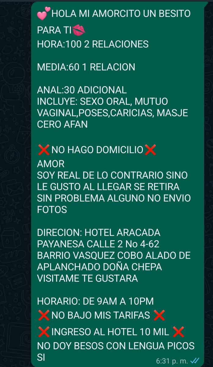 Ese día tenia un tiempo alrededor de 2 horas libres así que decidí llamar una Scort a domicilio serca al lugar que estaba esperando en el norte la cuidad. Ya había visto el anuncio y me mereció buen material además que le escribí a otras más pero en precio y fotos me convenció ella. Cuadramos precio, lugar y hora. Ya esperando el servicio me llamo furiosa. el tipo del taxi como que no conocía popayan y le había dicho que no existía esa dirección. Me trato suplemento mal de insultos para arriba, que por que le ponía a perder el tiempo, que yo era un payaso, desocupado. Debí haber cancelado el servicio. Pero ese día estab tranquilo y con ganas de culpar, le dije que yo soy una persona seria y una cosa es que yo le haga perder tiempo y otros es que el taxista no conozca la cuidad. Así que me paso al conductor y le explique. Me pidió el favor que cuando llegara le pagará el taxi. No me gusto por la volteada de salir del hotel y entrar con ella, pero ya estaba yo con la calentura y ganas de comérmela ademes no alcanza a pedir otra, el hotel ya estaba pago así que ni modos a salir a pelar la cara fuera del hotel. Cuando llego mire un caballote la cara no me gusto mucho se veia mas vieja que las fotos, pero ya no había nada que hacer así que salí y le pague el taxi pero inmediatamente me entre. Oviamente llego con la pinta repesentanso muy bien en que trabaja. la señora el hotel jaja me miraba con esa cara de culpable. Ya no se podia hacer más.