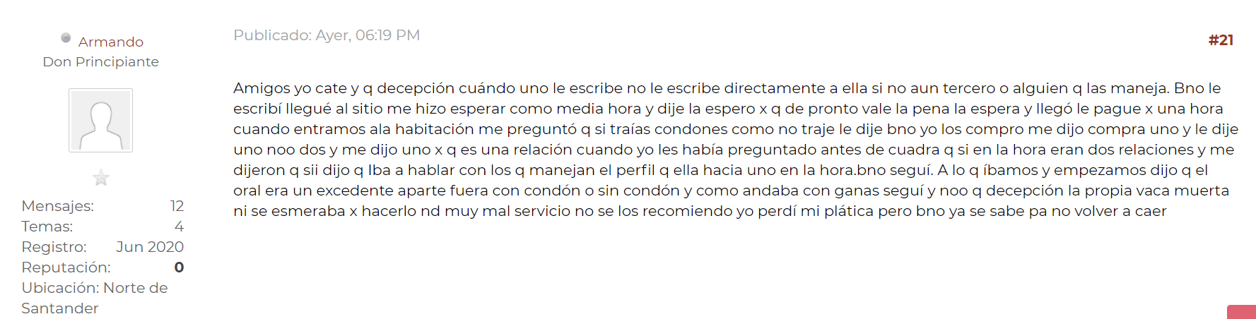8. Quiero dejarle claro a la nena que en ningún momento hubo mal trato por parte de ella hacia mi y viceversa, me pareció una prepago (+18) normal, le aclaro que se esmeró en su servicio, no es mal polvo, que otro usuario diga que si es mal polvo no es mi problema, que le reclame a el, mi intensión nunca es dañarle el trabajo a nadie, y si fue una confusión pues que venga y lo aclare, y desmienta al usuario Armando. En fin señores esto es muy incomodo para mi, yo soy un tipo muy tranquilo y decente para que esta prepago (+18) me venga a tratar de mentiroso y poco hombre, quiero pensar que es de rabia que me dice eso, en fin, voy a adjuntar las capturas pertinentes como pruebas, espero su compresión en estos temas tan incómodos y hartos. Un saludo.
