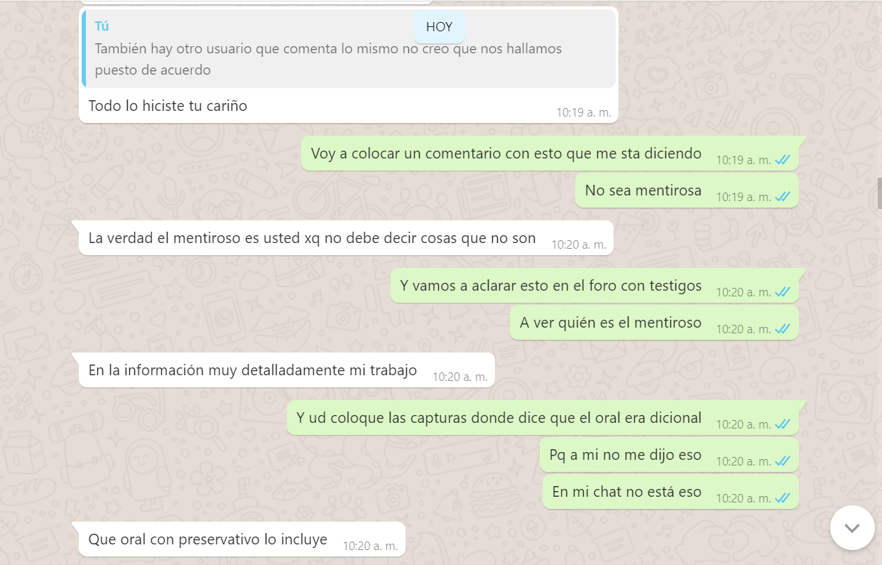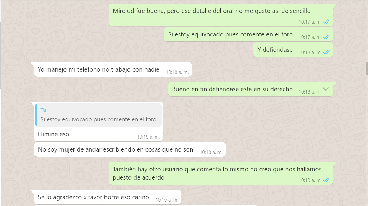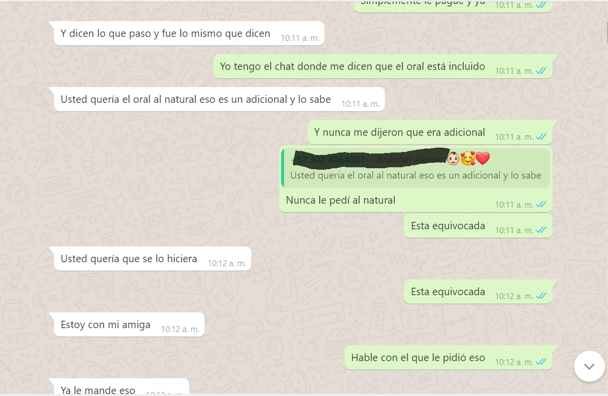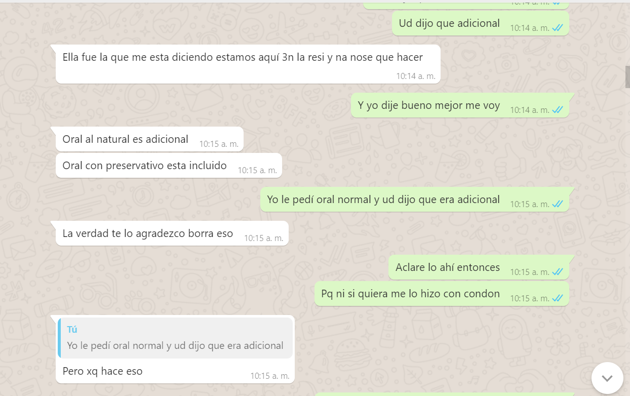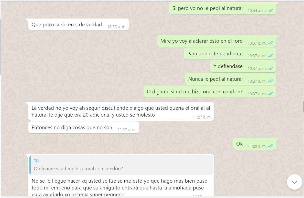 3. Me dice que yo le pedí el oral pero al natural, que al natural era adicional pero que con condón si era incluido, Mentira, nunca se lo pedí al natural, yo le dije que si hacia el oral, es mas yo tenia aun puesto el condón, y me dijo que no que era adicional, pero la nena ahora me dice que quizás yo entendí mal o se confundió y pensó que yo se lo estaba pidiendo al natural, es mas reconoce que no me hizo el oral (adjunto pruebas del chat), y bueno le voy a dar el beneficio de la duda pq es cierto yo no le especifique algo que era obvio, pero si va incluido ella lo hubiera hecho de una, o me dice, solo lo hago con preservativo, es mas ni si quiera me puso el condón, me lo tuve que poner yo mismo, y con el comentario del usuario Armando el si aclara que ella le dijo que era adicional con o sin condón, así que saquen sus conclusiones.