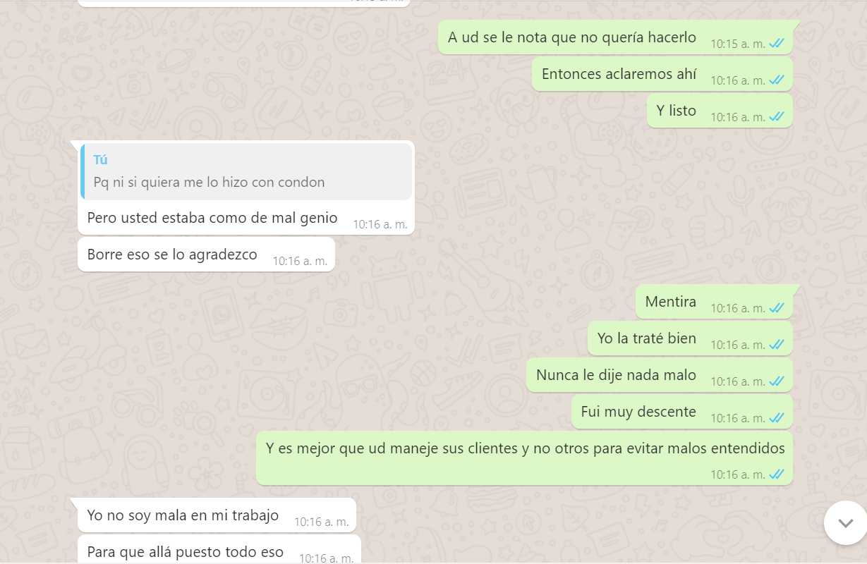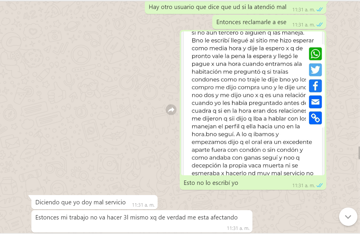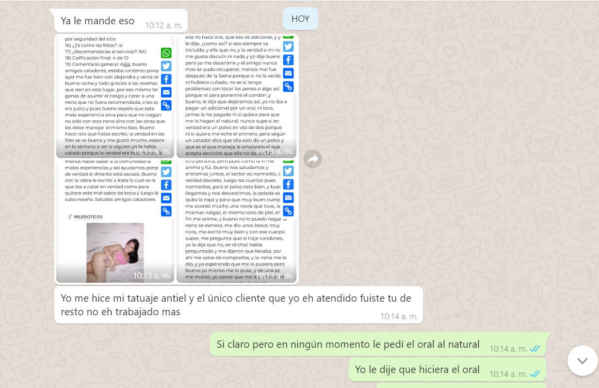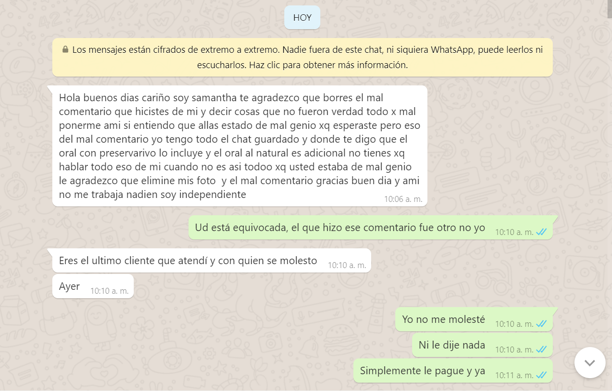 3. Me dice que yo le pedí el oral pero al natural, que al natural era adicional pero que con condón si era incluido, Mentira, nunca se lo pedí al natural, yo le dije que si hacia el oral, es mas yo tenia aun puesto el condón, y me dijo que no que era adicional, pero la nena ahora me dice que quizás yo entendí mal o se confundió y pensó que yo se lo estaba pidiendo al natural, es mas reconoce que no me hizo el oral (adjunto pruebas del chat), y bueno le voy a dar el beneficio de la duda pq es cierto yo no le especifique algo que era obvio, pero si va incluido ella lo hubiera hecho de una, o me dice, solo lo hago con preservativo, es mas ni si quiera me puso el condón, me lo tuve que poner yo mismo, y con el comentario del usuario Armando el si aclara que ella le dijo que era adicional con o sin condón, así que saquen sus conclusiones.