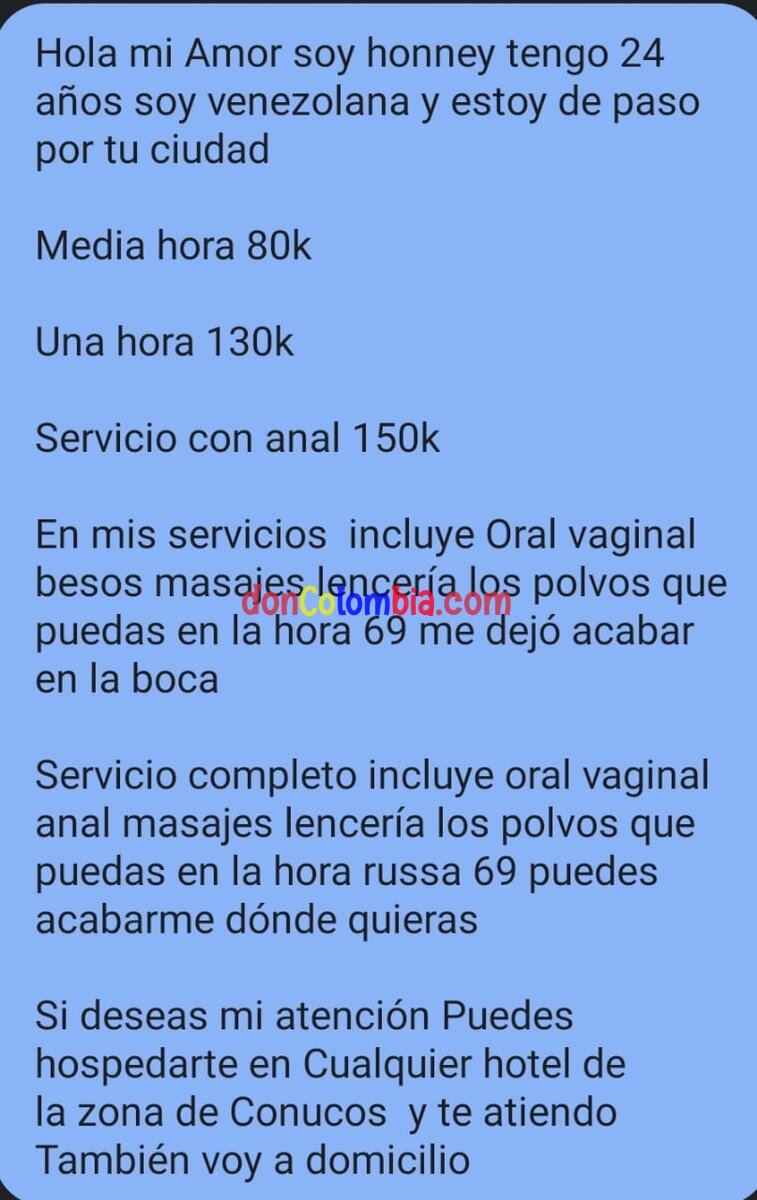 pues realizando una búsqueda inversa por las imágenes que subió se puede decir que al menos la nena si se dedica a los servicios de sexuales al menos hasta principios de año estaba en la caracas por una zona que se llama el rosal el numero que usaba 04125058194 mismo que aun aparece activo , lo raro es que mueve en un grupo de chicas especialmente con una churca que se hace llamar alondra de la cual no vi publicaciones de bucaramanga aunque si dice que hace tríos puede que sea con ella la verdad la favor tiene que la descripción que da de los servicios mantiene relación con las de las publicaciones de venezuela así como el nombre de honney lo otros es que las fotos que subió en mileroticos no son descargadas de las paginas donde ha publicado sus servicios como las que yo subo acá y por ejemplo la que esta en rubia es un cambio de color realizado con alguna app la de mileroticos se podría considerar la original. entonces las fotos son reales, hace 20 días no se publica en venezuela puede que viajara y pues bucaramanga seria como un primer destino para trabajar antes de llegar a medellin quizas.