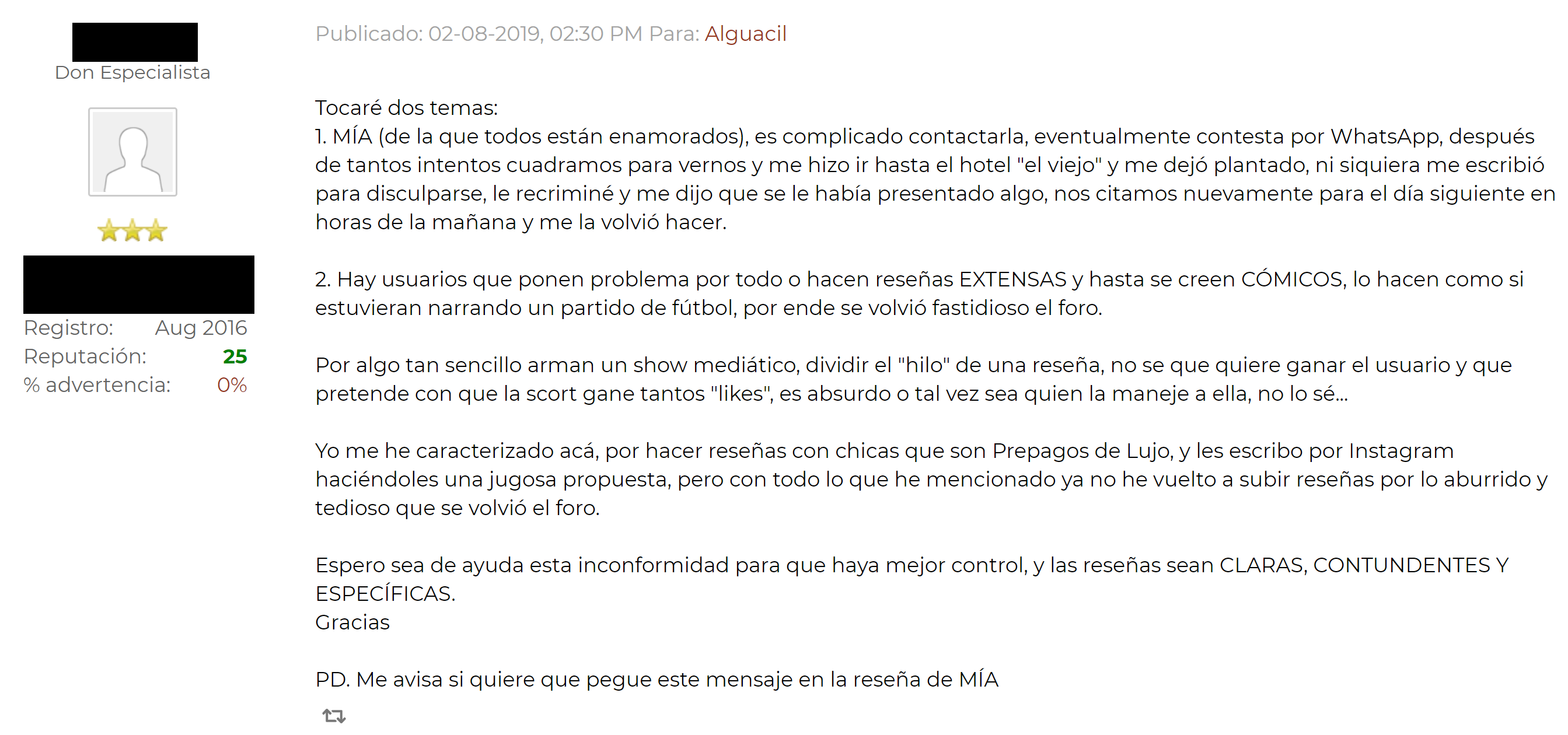 [font=Verdana,Geneva,sans-serif]Con respecto a Blackch: Este usuario fue presentado en mayo como candidato a usuario VIP en la Sala VIP. Lástimosamente sus votos no fueron suficientes para ascender y su candidatura fue rechazada. Se le hizo un comunicado haciéndole unos sugerencias. Desde Mayo se le viene haciendo un seguimiento, pero como sucede en cualquier contexto, cuando alguien es rechazado debe pasar un tiempo prudente para ser evaluado nuevamente. En este tiempo le he tenido que hacer alguna que otra sugerencia (como tener un poco más de tacto al referirse a las scorts, ya que esto puede generar discusiones innecesarias en el foro). También he recibido inconformidades hacía él por parte de usuarios. Aunque no acostumbro a hacer esto público, voy a mostrar la última inconformidad sin mencionar el usuario (ver imagen).[/font]