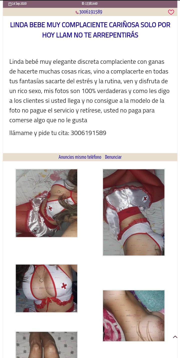 24) Comentario general: llegue arrechisimo un sábado en la mañana creo que fui el primero de la ciudad que tomó el servicio ya habíamos hablado y madrugo a escribirme y jugamos por wassp calentando el tema cuando me ha rio y la vi me alcanzo a desinfla y me quize ir pero me esperaba con el dizfras de emfermera y se veía muy simpática sexy y de buena actitud decidí tomar media hora, me beso riquísimo gimiendo toda ganosa le toque la vagina y estaba mojada