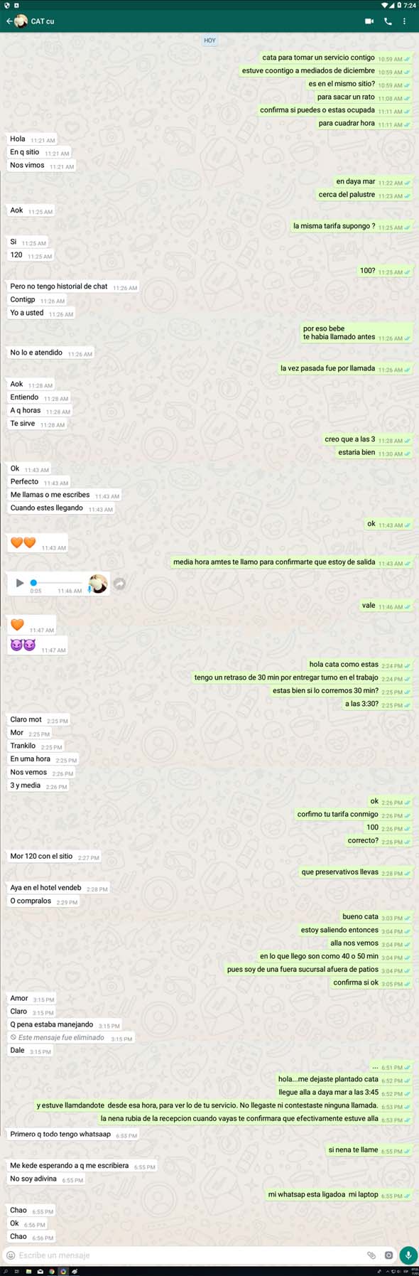 [attachment=14714][attachment=14714][attachment=14714]Hola parceros puteros, el dia de hoy me dispuse a degustar a catalina, a lo cual desde temprano la contacte para agendar hora. Acordamos a las 3 pm, a lo cual por una demora con mi turno le dije un poco mas tarde. Quedamos OK. A las 3:45 pm cuando estoy a poco de llegar, le repico a catalina unas cuantas veces. (No contesta celular). Ingreso entonces al hotel dayamar, tal vez ya estaba allá, la nena que atiende una rubia me dice que tal vez debe estar por llegar. (nada) . Procedo a salir del hotel y buscar donde llamarla para confirmar si demoraba o si estaba cerca. Aproximadamente hice 5 llamadas. Ya eran las 4:20 pm cuando me retire pues ni quiso contestar ni nada.