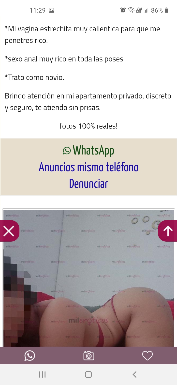viejo @"dracula"no me había fijado en que mo aparece el número como  yo le escribí por watsap .. como a casé todas .. hay esta la opción en mileroticos de escribirles al watsap cuando ellas solo desean que les escriban .. y a ella le hice la vicita por los lados de boston.. pero ese día me dijo que venía de trabajar por la 21 y que se hiba que mudar de boston también...que por cierto me dejo curiosidad de eso de los lados de la 21.. y si claro las fotos tienen retoque como la gran mayoría...pero como dije me gusta mucho más el color de piel morena en persona y lastima no muestra el rostro por que es bien llamativo y perverso jajajajja...