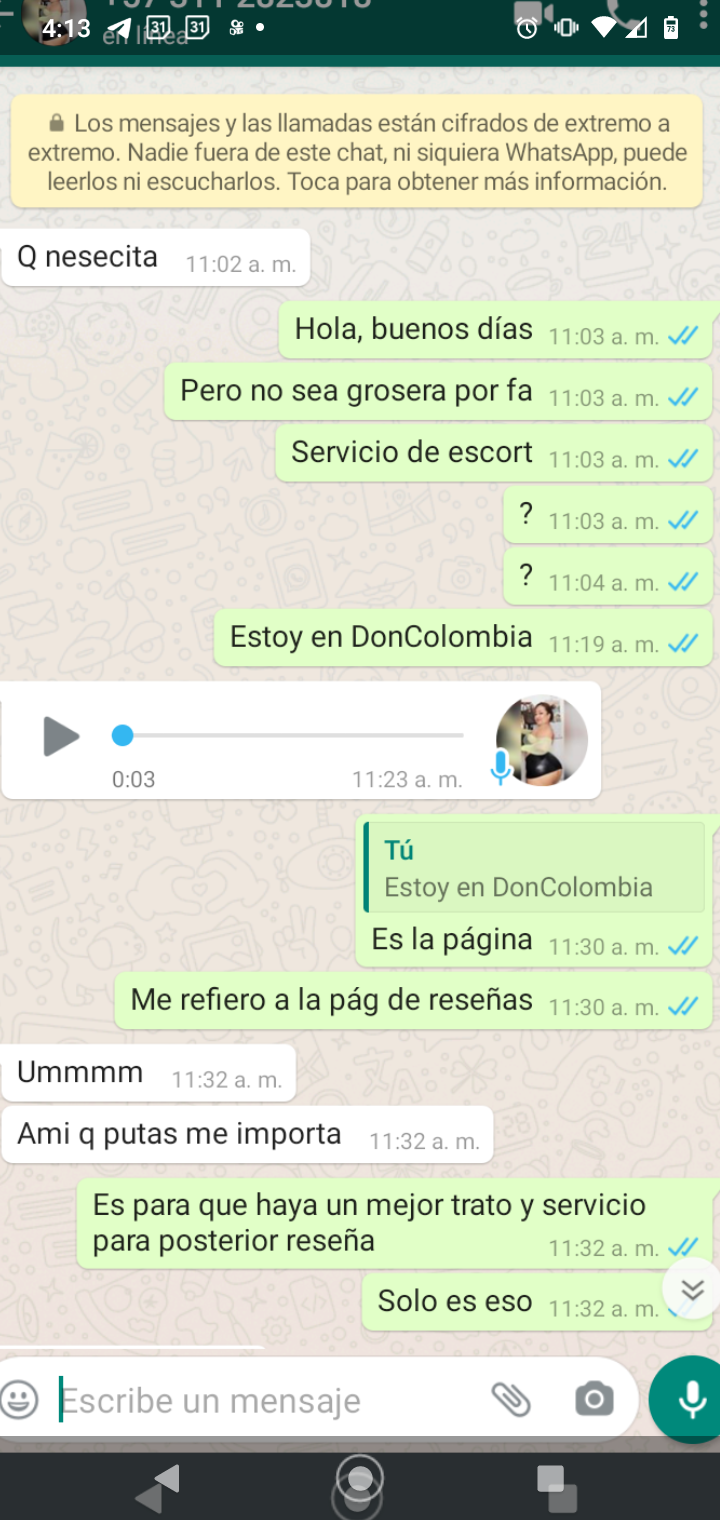 Le escribo, no responde, la llamo y rechaza llamada, hasta ahí todo normal porque ajá, eso es normal, lo curioso es que le escribo y le digo que quiero el servicio y que cuánto cobra y demás, me parece una madura pues no bonita, pero si aguanta para la cogida y lo digo por el culote que tiene aunque le falte tetas y las tenga pequeñas, un amigo me había contado que había estado con ella y que el polvo muy normalito y que la vieja era muy fría, pero la verdad hice casi omiso a eso y quise probarla por el culo, la verdad solo por eso, me responde con un "qué necesita?", Le digo que quiero el servicio, optó por decir que estoy en Don Colombia para que me den un mejor trato, por lo general cuando uno les dice que uno pertenece al foro, mejoran el trato porque saben que así aseguran buena reseña y eso, uds ya saben, estrategia de catador, no lo veo mal la verdad y creo que uds tambien lo hacen una que otra vez , yo opté por hacer esto con la dama porque ya había leído por acá que tenía mal trato hacia los clientes, entonces procuré hacerlo por dicha razón, la vieja anda entre Barrancabermeja y otras ciudades, obviamente no puedo dar detalles en eso, pero es otro cuento, la situación es que quiero comentar mi caso en el foro y bueno, espero que no caigan en esto, lean las otras reseñas también.