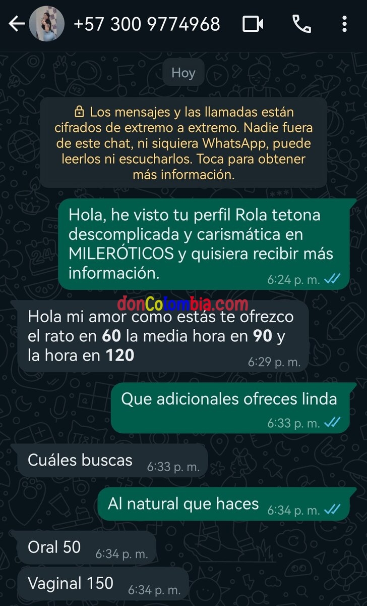 Hola muchachos pues la verdad estuve viendo el foro y me dio curiosidad nunca e tomado un servicio por esa soná entonces solo escribí a curiosiar y afirmativamente presta servicio de sexo al natural cobra 50 por oral al natural y 150 por vajina.