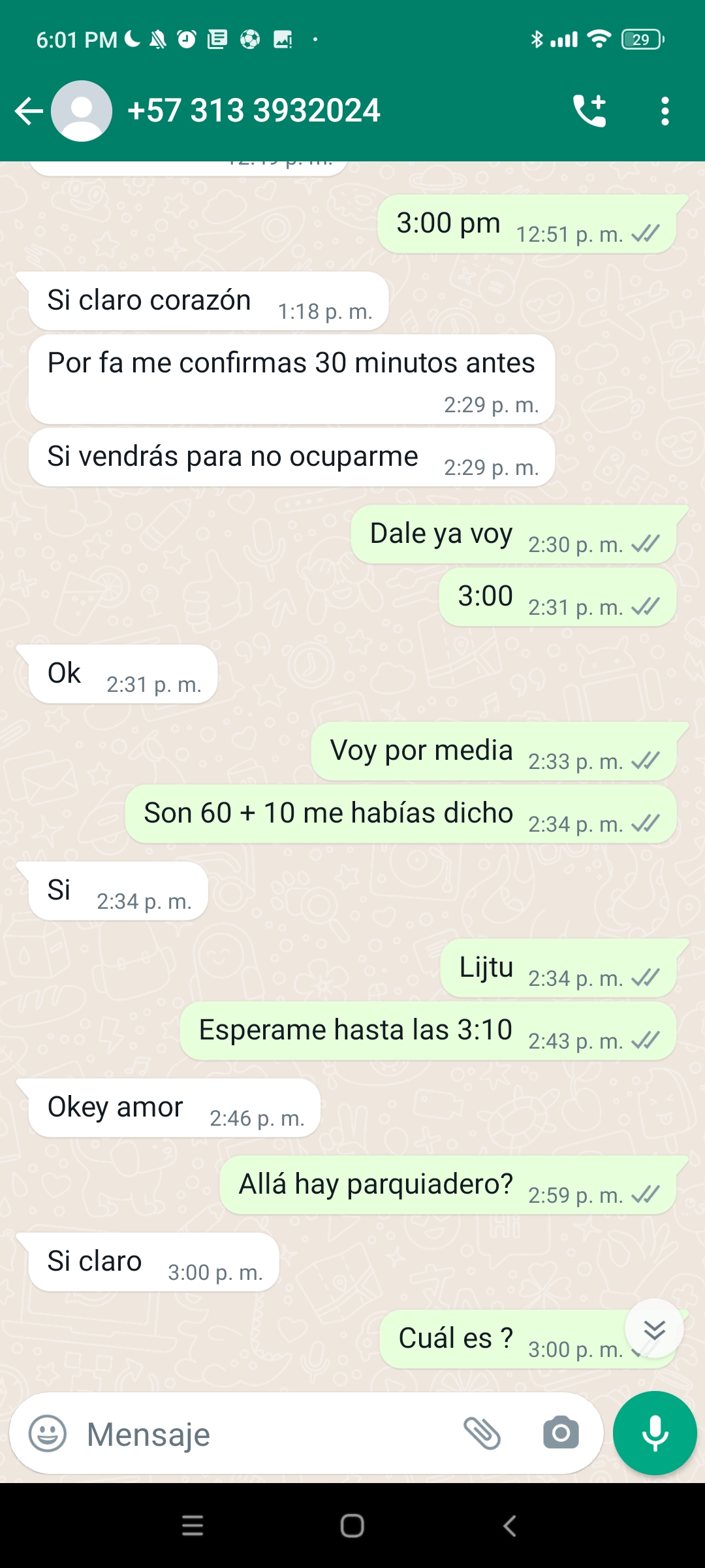 - Le dije que tenía el dinero exacto o sea 70 mil ( 60 el servicio + 10 de peaje ) sin embargo ya en el hotel me escribió que no tenía preservativos que los pidiera, los pedí y los pagué.