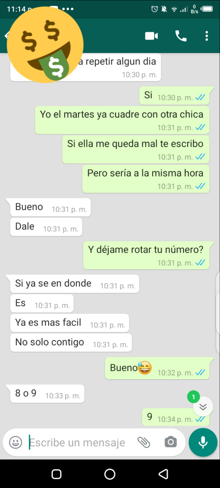 Está chica y yo ya habíamos hablado antes pero nunca pudimos concretar, ella me dice que me tenía guardado y que me escribió porque nesecitaba plata y pues que no había borrado mi contacto xD